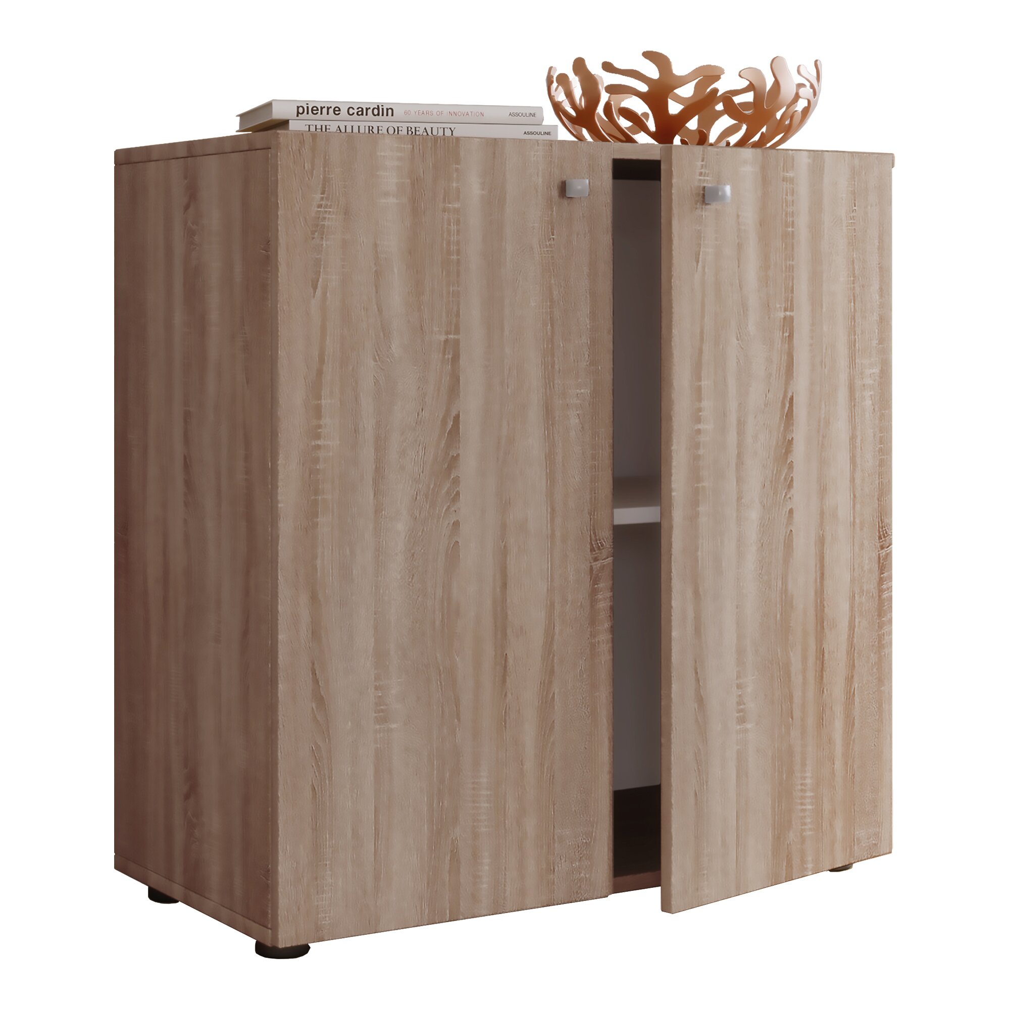 Highlights: Zwei große Fächer sorgen für ausreichend Stauraum. Als Staubschutz dienen zwei große Klapptüren. Korpus aus stabilem Material. Holzstruktur Nachbildung. Die universell einsetzbare Kommode Vandol 1 passt in jedes Wohnzimmer oder Büro und wird gerne mit den weiteren Vandol Komoden V2, V3 und V4 kombiniert.