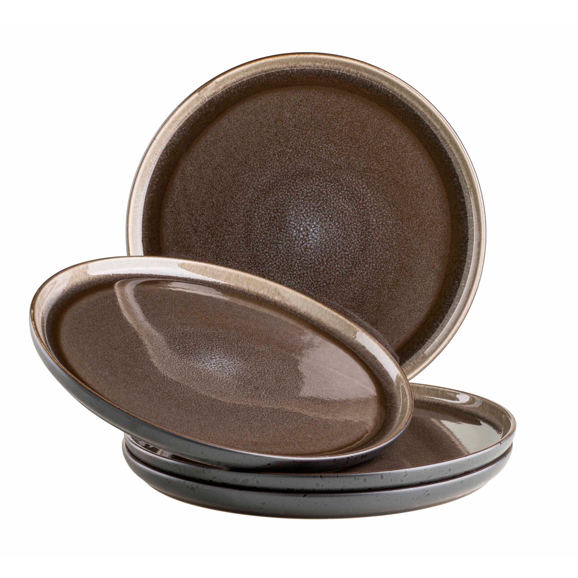 Die unvergleichliche Keramikgeschirr-Serie „Niara“ der österreichischen Traditionsmarke Mäser verbindet auf einzigartige Weise selbstbewusste skandinavische Formen mit zwei unterschiedlichen Glasurtechniken: Auf den Ober- bzw. Innenseiten der Geschirrteile fließen strahlende Farbschattierungen auf schwarzem Untergrund zu wunderbaren Maserungen zusammen. Die Außen- bzw. Unterseiten hingegen bestechen durch eine Mattglasur in Schwarz, welche mit glänzenden schwarzen Sprenkeln überzogen wurde. Durch die händisch aufgetragenen Farben ist jedes Teil in dieser Kollektion auf allen Seiten einzigartig gemustert. Mit ihrem exquisiten und individuellen Charakter ist die Kollektion „Niara“ ein echter Hingucker auf jedem Esstisch. Gefertigt aus langlebigem, hochwertigem Steinzeug (welches nicht mit dem deutlich brüchigeren Steingut zu verwechseln ist) wird Ihnen dieses Geschirrset lange Freude bereiten. Selbstverständlich ist die gesamte Serie „Niara“ mikrowellen- und spülmaschinengeeignet. Dieses Set wird in einer vielfach auf Bruchsicherheit getesteten Paketversandverpackung aus nachhaltigen Materialien versendet. Bitte beachten Sie: Diese Kollektion wird händisch lasiert, wodurch minimale Unebenheiten der Glasur, kleine Einschlüsse und leichte Farbabweichungen auftreten können. Zur besseren objektiven Vergleichbarkeit gehen unsere Füllmengenangaben von einer randvollen Befüllung aus.Dieses Set besteht aus: Teller flach 27 cmFarbe: Schwarz / GrauAnzahl: 4Material: SteinzeugPersonenanzahl: 4Serie: NiaraVerzierungsfarbe: Farbig ohne Dekor
