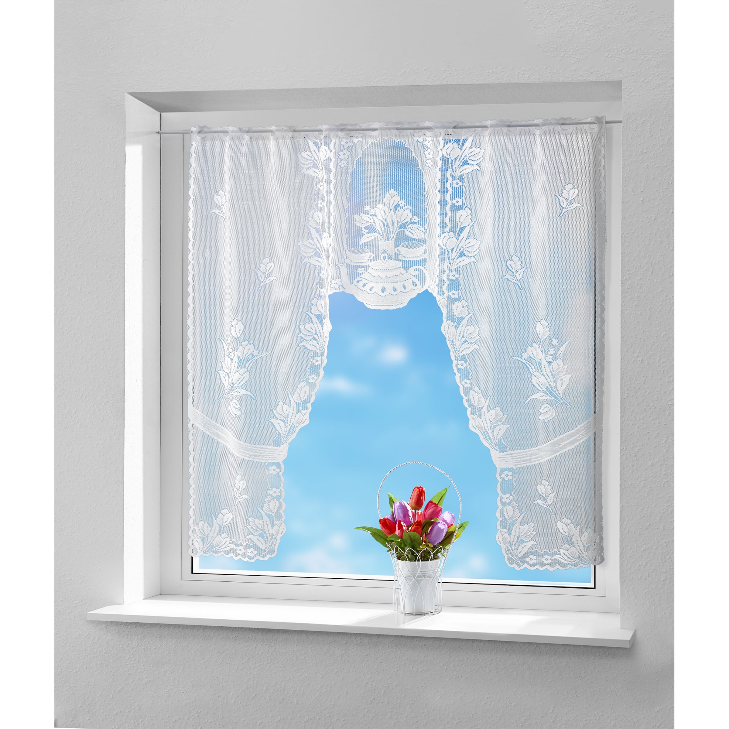 Diese halbtransparente Spitzen-Gardine verleiht Ihrem Zuhause eine elegante und romantische Note, während sie gleichzeitig subtile Frische in jeden Raum bringt. Die zarten Tulpenmotive aus hochwertiger Spitze filtern sanft das Tageslicht und setzen einen ansprechenden Rahmen um Ihr Fenster.