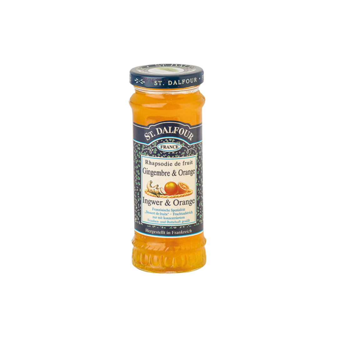 St. Dalfour Fruchtaufstrich Ingwer & Orange Unser Fruchtaufstrich Ingwer & Orange von St. Dalfour ist eine köstliche Kombination aus würzigem Ingwer und fruchtiger Orange. Hergestellt aus Fruchtsaftkonzentrat, Geliermittel und den besten natürlichen Zutaten ist dieser Aufstrich ein wahrer Genuss und eine köstlich-fruchtige Wahl für Ihr Frühstück oder einen Snack zwischendurch. Die Packung enthält 284 Gramm des köstlichen Fruchtaufstrichs, mit einem Bruttogewicht von 508 Gramm. Dieser Aufstrich hat eine außergewöhnliche Kombination aus Aromen und einen einzigartigen Geschmack. Unser Fruchtaufstrich Ingwer & Orange ist vielseitig und kann als Brotaufstrich, als Zutat in Dressings oder Saucen oder als Dekoration für Desserts verwendet werden. Diese köstliche Kombination aus Ingwer und Orange ist auch der perfekte Begleiter für Käse. Bestellen Sie jetzt und genießen Sie den köstlichen Geschmack unseres Fruchtaufstrichs Ingwer & Orange von St. Dalfour. Hergestellt aus den besten Zutaten und sorgfältig verarbeitet, ist dieser Aufstrich eine gesunde und köstliche Wahl für alle, die auf Qualität und Geschmack achten. Machen Sie Ihr Frühstück zu einem besonderen Erlebnis und genießen Sie den würzigen Geschmack von Ingwer und Orangen. Fruchtaufstrich Ingwer & Orange Netto Füllmenge Bruttogewicht 508.00 Gramm,Nettogehalt 284.00 Gramm Allergene Aufbewahrung Nach dem Öffnen gekühlt lagern & innerhalb von 3 Monaten aufbrauchen Zutaten Zutaten: Fruchtsaftkonzentrat (Trauben- und Dattelsaftkonzentrat) 64,4%, Orangen 19%, Ingwer 16%, Geliermittel: Pektine, Zitronensaft. Nährwerte pro 100g Unzubereitet 100 Gramm, Energie 1.013,00 kJ, Energie 242,00 kcal, Fett 0,80 g, davon gesättigte Fettsäuren 0,01 g, Kohlenhydrate 59,00 g, davon Zucker 57,00 g, Eiweiß 0,50 g, Salz 0,03 g Ursprungsland FRANKREICH Hersteller Name: ST DALFOUR SAS,Adresse: Chemin de Cazeaux, F-47200 Marmande.,Email: info@schenkel.at
