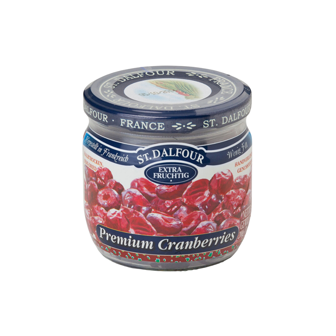 St. Dalfour Premium Cranberries, halbtrocken Entdecken Sie die extra fruchtigen und weichen St. Dalfour Premium Cranberries – halbtrocken für ein besonderes Geschmackserlebnis. Die Cranberries sind vollmundig, saftig und ein köstlicher Snack für zwischendurch oder als Zutat für verschiedene Gerichte. In der Packung befinden sich 200 Gramm halbtrockene Cranberries mit einem Gehalt von 65,5%. Kunden schätzen das fruchtige und ausbalancierte Verhältnis zwischen Zucker und Cranberries. Unsere halbtrockenen Cranberries sind vielseitig einsetzbar und lassen sich hervorragend für Müslis, Backwaren, Smoothies oder zum Verfeinern von Salaten und anderen Gerichte verwenden. Lassen Sie sich von der Qualität und dem einzigartigen Geschmack unserer St. Dalfour Premium Cranberries – halbtrocken überzeugen. Bestellen Sie jetzt und erleben Sie einen leckeren Snack für Zwischendurch oder eine vielseitige Zutat für Ihre Gerichte. Cranberries halbtrocken Weich und extra fruchtig. Netto Füllmenge Bruttogewicht 420.00 Gramm,Nettogehalt 200.00 Gramm Allergene Aufbewahrung Nach dem Öffnen bitte im Kühlschrank aufbewahren und innerhalb von 8 Wochen verzehren. Zutaten Zutaten: Cranberries (65,5%), Zucker, Sonnenblumenöl. Nährwerte pro 100g Unzubereitet 100 Gramm, Energie 1.269,00 kJ, Energie 299,00 kcal, Fett 0,50 g, davon gesättigte Fettsäuren 0,00 g, Kohlenhydrate 71,00 g, davon Zucker 63,00 g, Eiweiß 0,50 g, Salz 0,01 g Ursprungsland FRANKREICH Hersteller Name: ST DALFOUR SAS,Adresse: Chemin de Cazeaux, F-47200 Marmande.,Email: info@schenkel.at
