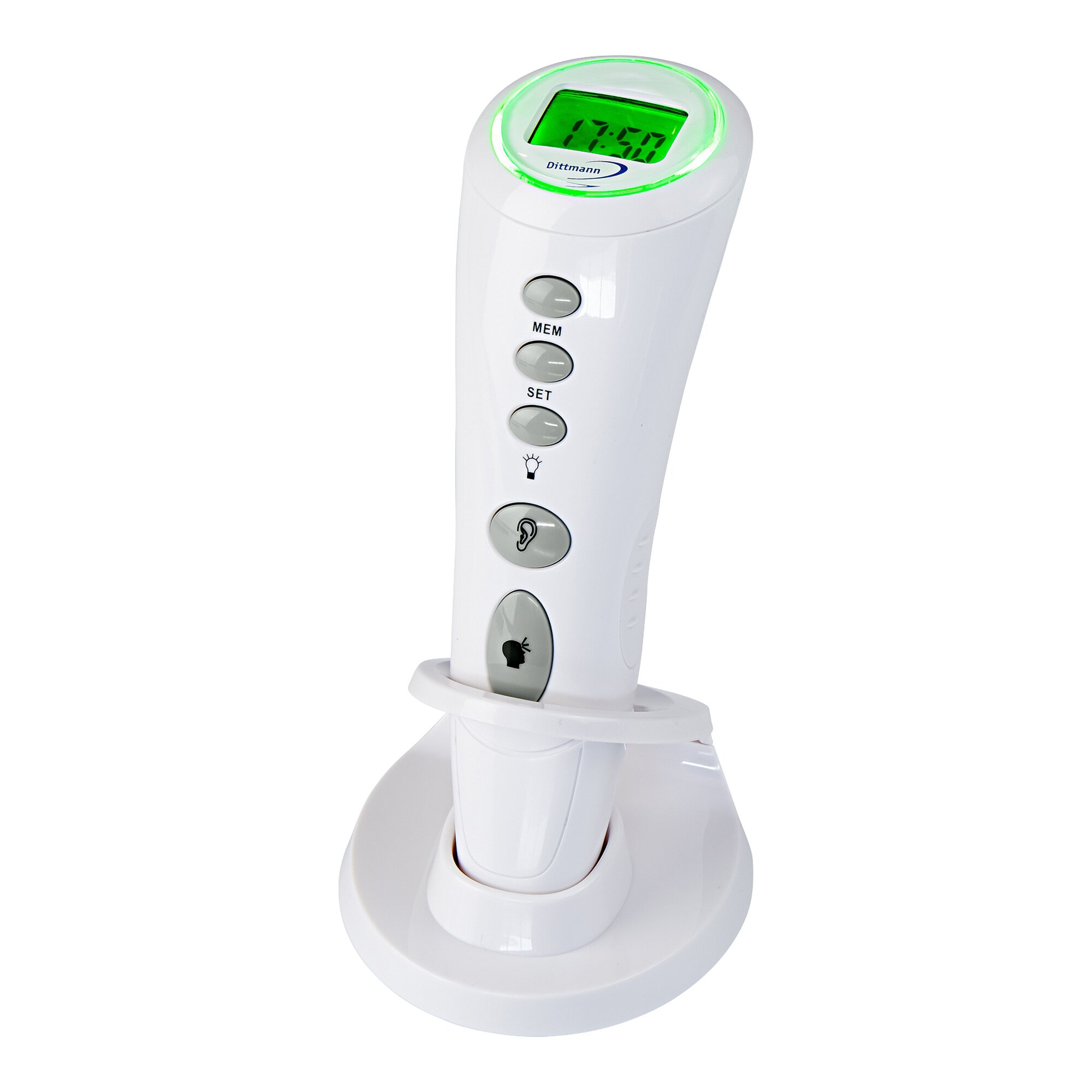 Misst die Körpertemperatur schnell und präzise. Die letzten 9 Messungen werden gespeichert. Mit integriertem Suchlicht. Anzeige von Uhrzeit, Datum und Raumtemperatur. Umschaltbar von Celsius auf Fahrenheit. Mit Warnhinweis „Reinigung der Messspitze“ für fehlerfreie Messung. Inklusive Standfuß für die sichere Aufbewahrung und Gebrauchsanweisung.