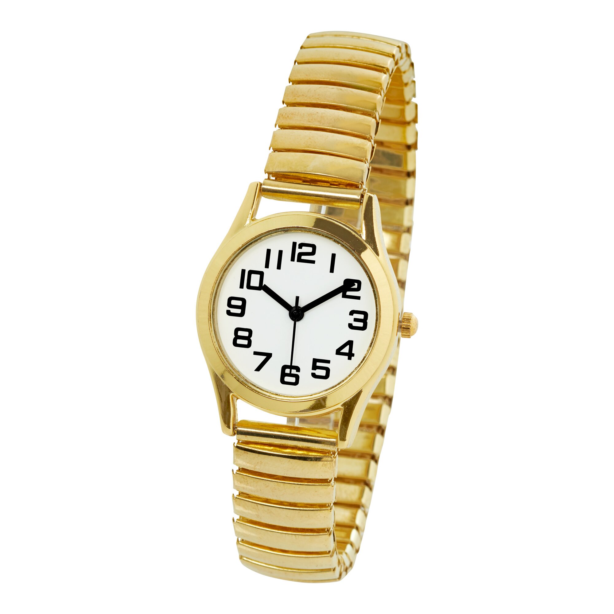 Diese Uhr ist ein echter Hingucker und das gleich in mehrfacher Hinsicht. Das goldfarbene Armband zieht alle Blicke auf sich, sieht aber nicht nur toll aus, sondern hat noch einen weiteren Vorteil: Es besteht aus einem elastischen Material, sodass es an fast jedes Handgelenk (Mindestumfang 18 cm) passt. Das große Ziffernblatt lässt sich auch von Weitem oder mit eingeschränktem Sehvermögen noch gut erkennen. Damit ist die Uhr ideal geeignet für Senioren und alle anderen, die die Uhrzeit gerne im Blick haben und dabei weder auf Tragekomfort noch auf Stil verzichten möchten.