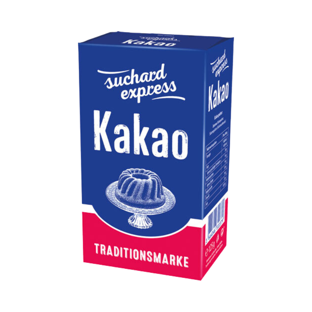 Suchard Express Kakao, 125 Gramm Kakaopulver Netto Füllmenge Bruttogewicht 143.00 Gramm,Nettogehalt 125.00 Gramm Allergene Zutaten Zutaten: Kakaopulver, Säureregulator (Kaliumcarbonate). Nährwerte pro 100g Unzubereitet 100 Gramm, Energie 1.680,00 kJ, Energie 405,00 kcal, Fett 20,00 g, davon gesättigte Fettsäuren 15,50 g, Kohlenhydrate 14,00 g, davon Zucker 1,90 g, Ballaststoffe 33,50 g, Eiweiß 23,00 g, Salz 0,05 g Verwendung Suchard Express eignet sich ebenfalls als Trinkkakao. Marke BENSDORP Hersteller Name: Winkelbauer GmbH,Adresse: Ketzergasse 6-8, 1230 Wien
