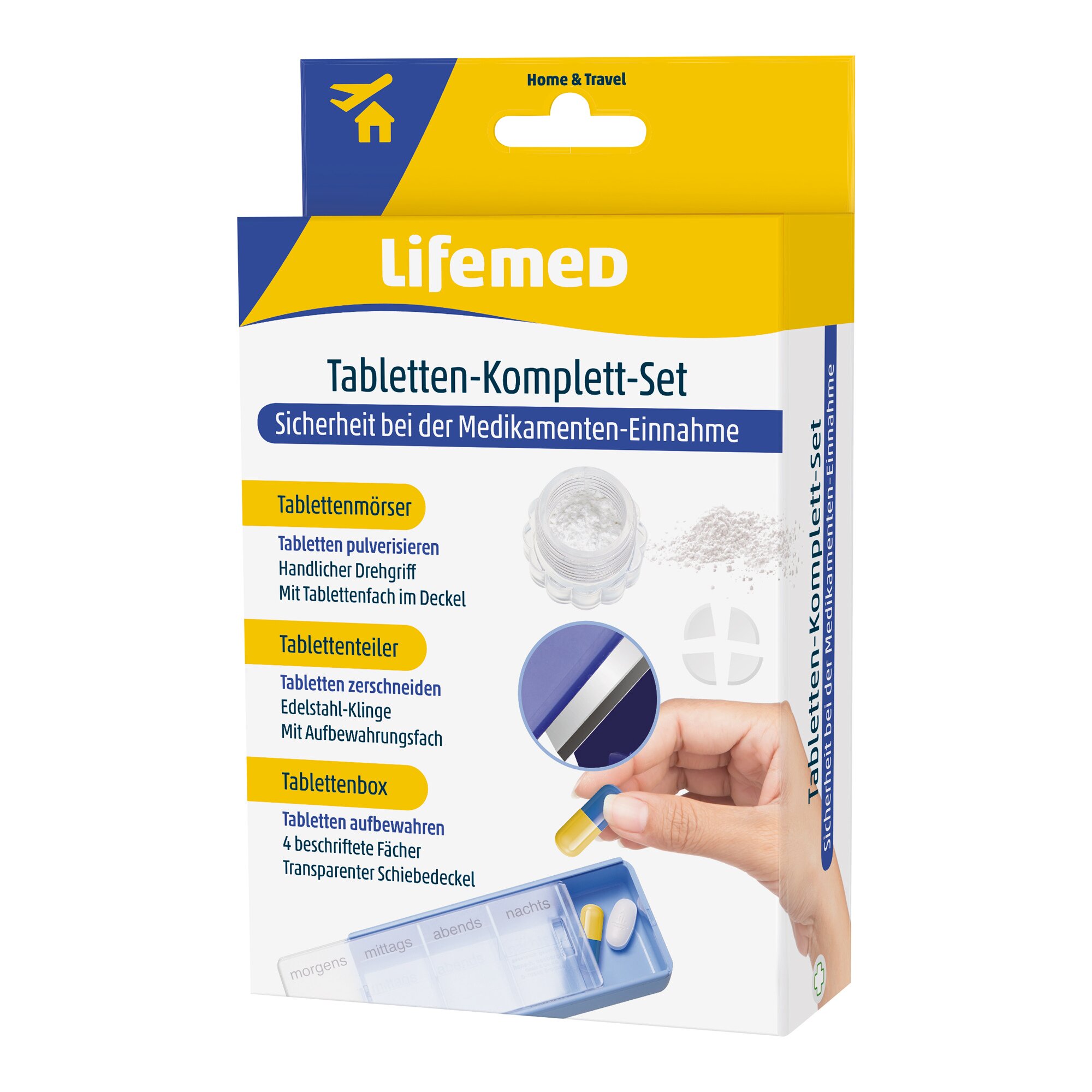 Perfekte Hilfe bei der täglichen Medikamenteneinnahme. 3-teiliges Set bestehend aus Tablettenteiler mit scharfer Klinge, Tablettenmörser mit geriffeltem Drehgriff und beschrifteter Aufbewahrungsbox mit 4 Fächern.