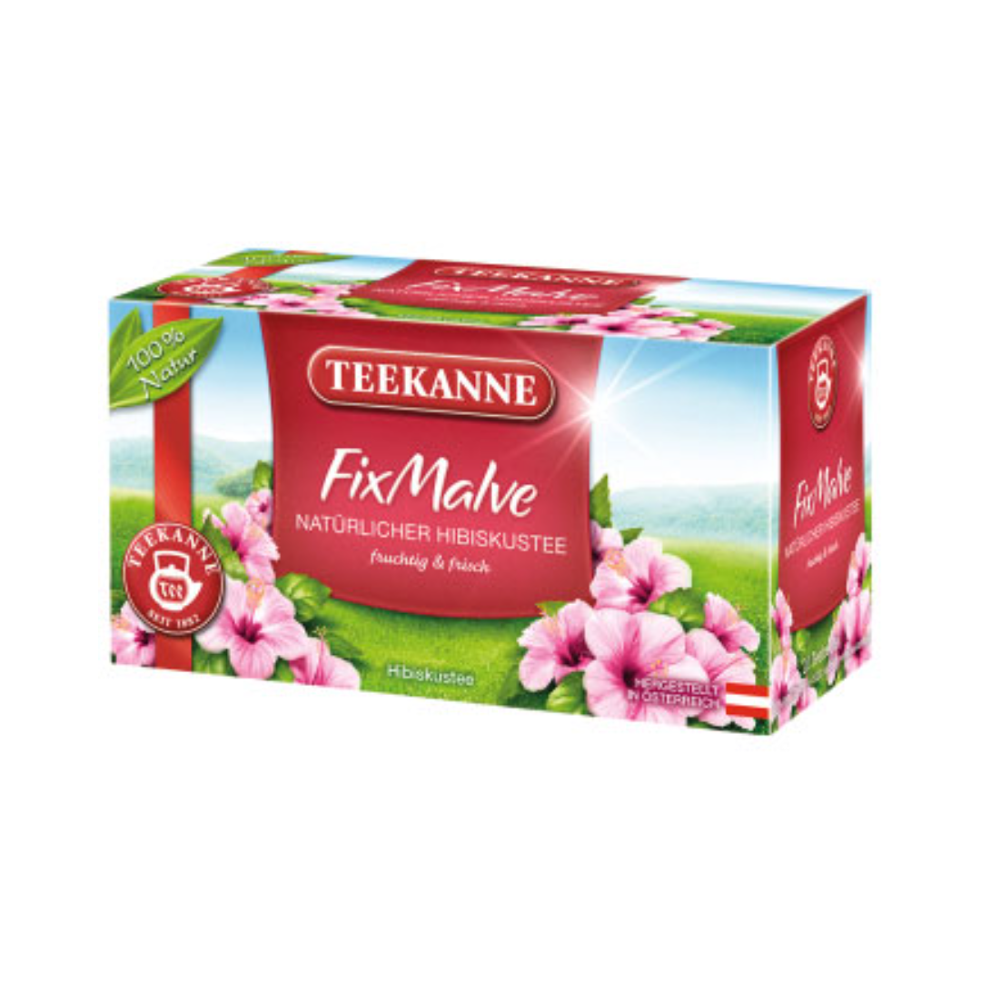Teekanne FixMalve, natürlicher Hibiskustee, 20 Teebeutel im Kuvert, 40g Hibiskustee Netto Füllmenge Bruttogewicht 71.00 Gramm,Nettogehalt 40.00 Gramm Allergene Aufbewahrung Vor Wärme geschützt und trocken lagern Zutaten Hibiskus Nährwerte pro 100g Zubereitet 1 Portion, Energie 2,00 kcal, Energie 9,00 kJ, Fett 0,00 g, davon gesättigte Fettsäuren 0,00 g, Kohlenhydrate 0,40 g, davon Zucker 0,00 g, Eiweiß 0,00 g, Salz 0,00 g , Zubereitet 100 Milliliter, Energie 1,00 kcal, Energie 4,00 kJ, Fett 0,00 g, davon gesättigte Fettsäuren 0,00 g, Kohlenhydrate 0,20 g, davon Zucker 0,00 g, Eiweiß 0,00 g, Salz 0,00 g Ursprungsland ÖSTERREICH Verwendung Sieden – Zubereitung der Speise in kochendem Wasser Teebeutel unbedingt mit frischem, sprudelnd kochendem Wasser aufgießen (200 ml) und 5-8 Minuten ziehen lassen. Hersteller Name: Teekanne GmbH,Adresse: Münchner Bundesstraße 120, A-5020 Salzburg