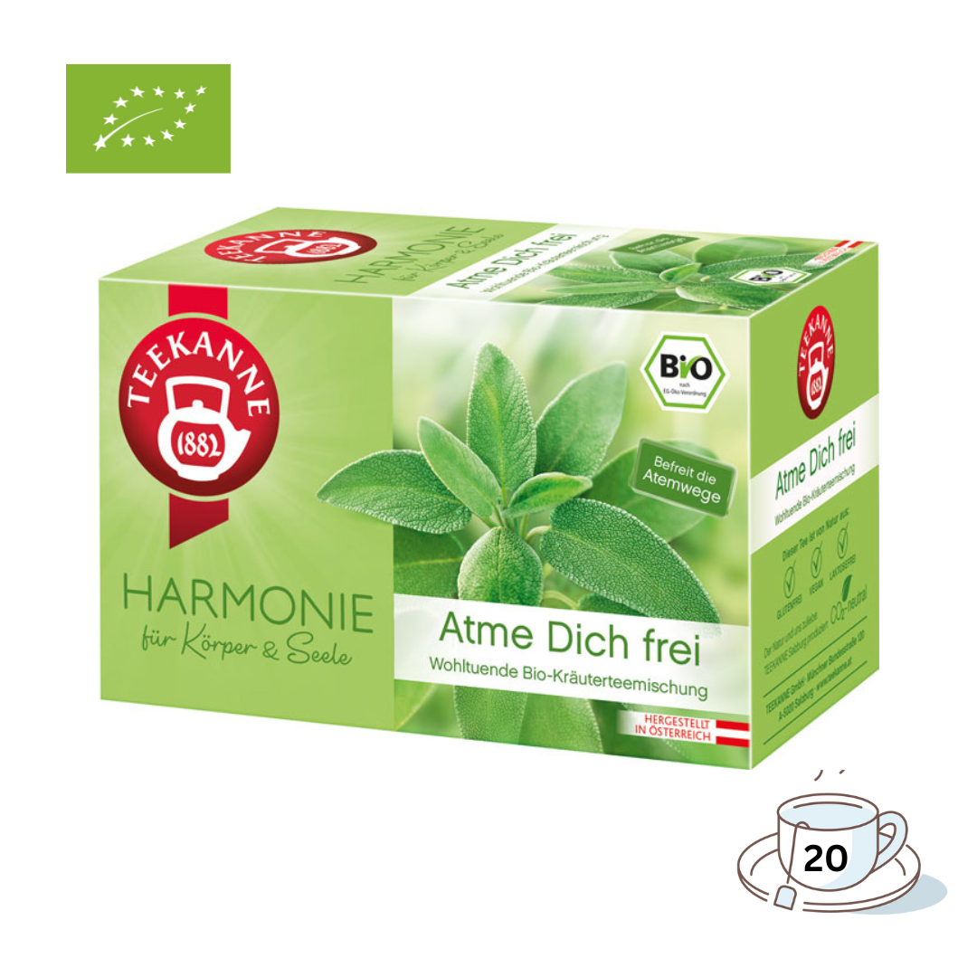 Teekanne Harmonie Bio Atme Dich frei, Kräuterteemischung, 20 Teebeutel im Kuvert Bio Kräuterteemischung Enthält Süßholz – bei hohem Blutdruck sollte ein übermäßiger Verzehr dieses Erzeugnisses vermieden werden Netto Füllmenge Bruttogewicht 79.00 Gramm,Nettogehalt 40.00 Gramm Allergene Aufbewahrung Vor Wärme geschützt und trocken lagern Zutaten Fenchel Orangenschalen Salbei Eukalyptus Süßholz Thymian Ingwer Zimt Nährwerte pro 100g Zubereitet 1 Portion, Energie 2,00 kcal, Energie 9,00 kJ, Fett 0,00 g, davon gesättigte Fettsäuren 0,00 g, Kohlenhydrate 0,40 g, davon Zucker 0,00 g, Eiweiß 0,00 g, Salz 0,00 g , Zubereitet 100 Milliliter, Energie 1,00 kcal, Energie 4,00 kJ, Fett 0,00 g, davon gesättigte Fettsäuren 0,00 g, Kohlenhydrate 0,20 g, davon Zucker 0,00 g, Eiweiß 0,00 g, Salz 0,00 g Gütezeichen Enthält Süßholz – bei hohem Blutdruck sollte ein übermäßiger Verzehr dieses Erzeugnisses vermieden werden Ursprungsland ÖSTERREICH Verwendung Sieden – Zubereitung der Speise in kochendem Wasser Teebeutel unbedingt mit frischem, sprudelnd kochendem Wasser aufgießen (200 ml) und 5 Minuten ziehen lassen. Marke TEEKANNE Hersteller Name: Teekanne GmbH,Adresse: Münchner Bundesstraße 120, A-5020 Salzburg