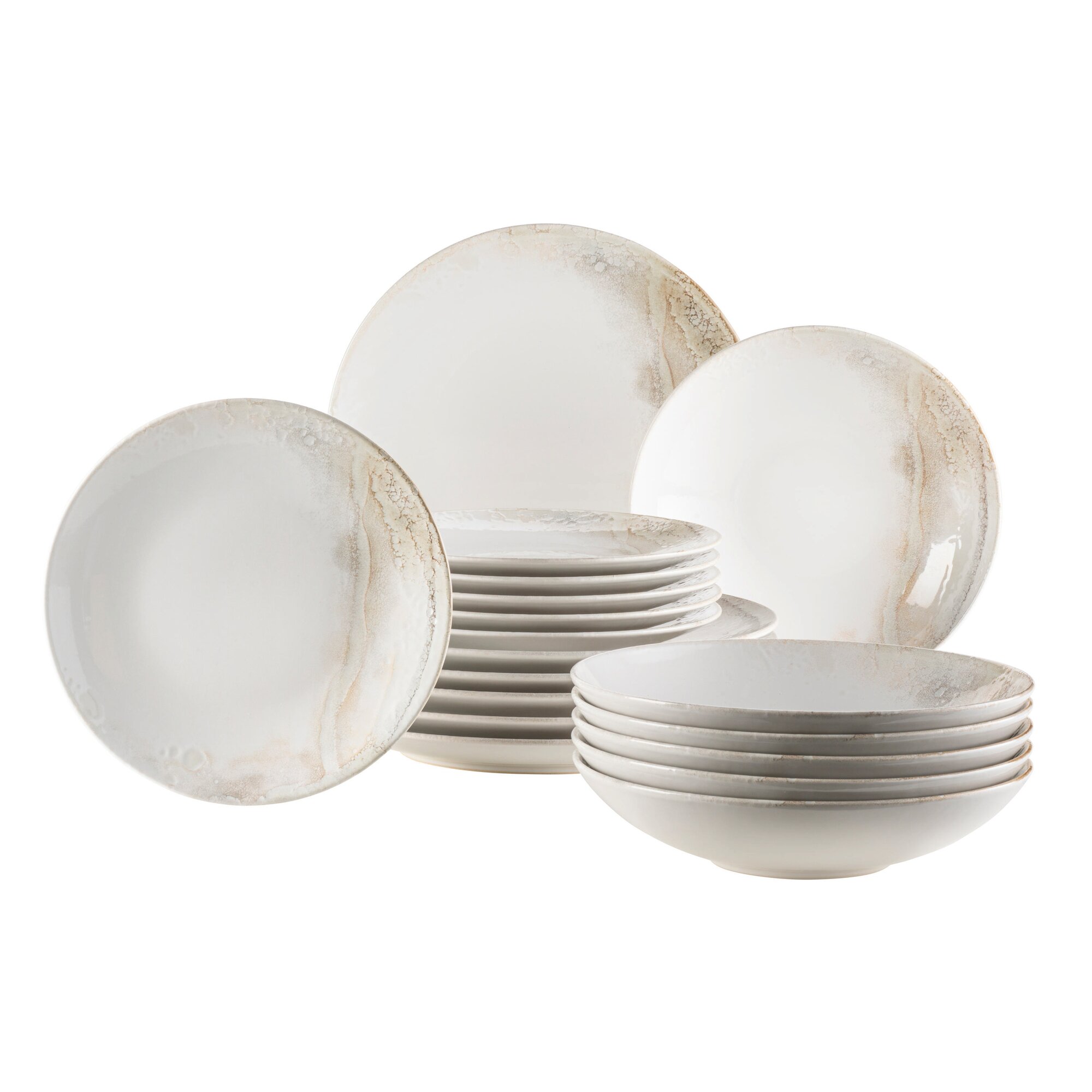 Herrlich duftender Waldgeruch, der Sie tief durchatmen lässt; aufblitzende Sonnenstrahlen, die immer wieder ihren Weg durch tanzende Blätter finden: Die Edition „Wooden Light“ der Keramikgeschirr Kollektion „Ossia“ bringt das unvergleichliche Gefühl der Entschleunigung aus der Natur auf Ihren Esstisch. Schlichte runde Coupe-Formen aus hochwertigem und robustem Steinzeug der österreichischen Traditionsmarke MÄSER, gepaart mit einem haptisch fühlbaren Dekor aus ineinanderfließenden Naturfarben – das ist das Geheimnis dieser Tafelgeschirr Kollektion, die mit viel Herzblut in Europa produziert wird. Die gesamte Serie „Ossia“, und selbstverständlich auch die Edition „Wooden Light“, ist dauerhaft spülmaschinen- und mikrowellengeeignet, und somit äußerst pflegeleicht. Dieses Set wird in einer vielfach auf Bruchsicherheit getesteten Postversandverpackung aus umweltfreundlichen Materialien versendet. Bitte beachten Sie: Um eine objektive Vergleichbarkeit zu gewährleisten, gehen unsere Füllmengenangaben von einer randvollen Befüllung aus.Dieses Set besteht aus: 6 x Essteller flach (Ø 27,5 cm)6 x Teller tief (Ø 22 cm, 900 ml Füllmenge) 6x Kuchenteller (Ø 21 cm)Anzahl: 18Farbe: Weiß / BeigeMaterial: SteinzeugPersonenanzahl: 6Serie: OssiaVerzierungsfarbe: Farbig mit Dekor