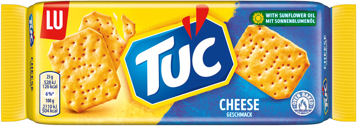 TUC Cracker Cheese, 100 Gramm Packung Kräcker mit Käsegeschmack. Netto Füllmenge Bruttogewicht 102.00 Gramm,Nettogehalt 100.00 Gramm Allergene WEIZENMEHL,GERSTENMALZEXTRAKT,MILCH,KÄSEPULVER,NATRIUMMETABISULFIT,KANN EIER,SOJA UND SESAMSAMEN ENTHALTEN. Kann Spuren enthalten von Sojabohnen und -erzeugnisse,Sesamsamen und -erzeugnisse,Eier und -erzeugnisse,Enthält – Ist im Produkt enthalten Milch und Milcherzeugnisse,Glutenhaltiges Getreide sowie daraus hergestellte Erzeugnisse Zutaten Zutaten: WEIZENMEHL, Sonnenblumenöl 22 %, GERSTENMALZEXTRAKT, Glukosesirup, Backtiebmittel (Ammoniumcarbonate, Natriumcarbonate), Speisesalz, Süßmolkenpulver (aus MILCH), Aromen, Geschmacksverstärker (E621, E627, E631), KÄSEPULVER 0,1 %, Mehlbehandlungsmittel (NATRIUMMETABISULFIT), Säureregulatoren (Citronensäure, Calciumlactat). KANN EIER, SOJA UND SESAMSAMEN ENTHALTEN. Nährwerte pro 100g Unzubereitet 100 Gramm, Energie 2.110,00 kJ, Energie 504,00 kcal, Fett 23,00 g, davon gesättigte Fettsäuren 2,20 g, Kohlenhydrate 64,00 g, davon Zucker 6,40 g, Ballaststoffe 2,30 g, Eiweiß 8,30 g, Salz 2,14 g Ursprungsland UNGARN Marke TUC Hersteller Name: Mondelez Österreich,Adresse: A-1140 Wien