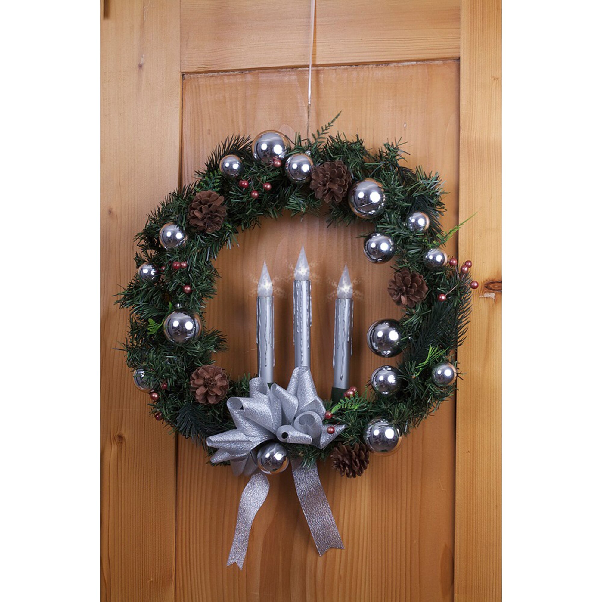 Bringen Sie festliche Freude in Ihr Zuhause mit unserem wunderschönen Türkranz aus Tannenzweigen! Die kunstvoll dekorierten Weihnachtskugeln und Zapfen verleihen ihm einen charmanten Look, während die drei flackernden LED-Kerzen eine gemütliche Atmosphäre schaffen. Ideal für die Weihnachtszeit wird dieser Kranz zum Blickfang an Ihrer Tür und sorgt für eine einladende Stimmung. Ganz gleich, ob drinnen oder draußen, er ist perfekt für jede Gelegenheit und bringt den Zauber der Feiertage direkt zu Ihnen nach Hause. Machen Sie Ihre Festtage unvergesslich!