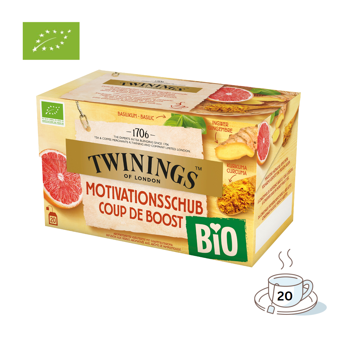 Twinings BIO Motivationsschub, aromatisierter Kräutertee mit Grapefruitaroma, 20 Teebeutel im Kuvert Entdecken Sie den Twinings BIO Motivationsschub, einen aromatisierten Kräutertee mit Grapefruitaroma, der Ihnen den perfekten Start in den Tag ermöglicht. Dieser Tee ist eine köstliche Mischung aus grünen Minzblättern, Kurkuma, Ingwer und Basilikumblättern, die aus biologischem Anbau stammen. Die natürliche Zitrusnote verleiht diesem Tee eine erfrischende Note, die Ihren Gaumen verwöhnt. Mit einer Nettogewicht von 40 Gramm und 20 Teebeuteln im Kuvert ist der Twinings BIO Motivationsschub perfekt für den täglichen Gebrauch geeignet. Einfach einen Teebeutel in eine Tasse geben, mit 250 ml kochendem Wasser übergießen und fünf Minuten ziehen lassen. Der Tee ist einfach zuzubereiten und sorgt für eine schnelle und köstliche Tasse Tee. Der Twinings BIO Motivationsschub ist ein perfekter Begleiter für alle, die einen guten Lebensstil pflegen und sich auf eine köstliche Art und Weise motivieren möchten. Die Kombination aus biologischen Zutaten und dem erfrischenden Grapefruitaroma macht diesen Tee zu einem einzigartigen Geschmackserlebnis. Probieren Sie ihn jetzt aus und lassen Sie sich von seinem Geschmack und seiner Wirkung begeistern. Aromatisierter Kräutertee mit Grapefruitaroma Netto Füllmenge Bruttogewicht 0.095 Kilogramm,Nettogehalt 40.00 Gramm Allergene Aufbewahrung Mindestens haltbar bis: siehe unten. Vor Wärme geschützt und trocken lagern. Zutaten Zutaten: Grüne Minzblätter*, Kurkuma* (33%), Ingwer* (22%), Basilikumblätter* (6%), natürliches Zitrusaroma (5%). *Diese Pflanzen stammen aus biologischem Anbau. Verwendung Sieden – Zubereitung der Speise in kochendem Wasser Anwendung: einen Beutel in eine Tasse geben, mit 250 ml kochendem Wasser übergießen, 5 Minuten ziehen lassen. Hersteller Name: Maresi Austria GmbH,Adresse: Postfach 111, 1131 Wien,