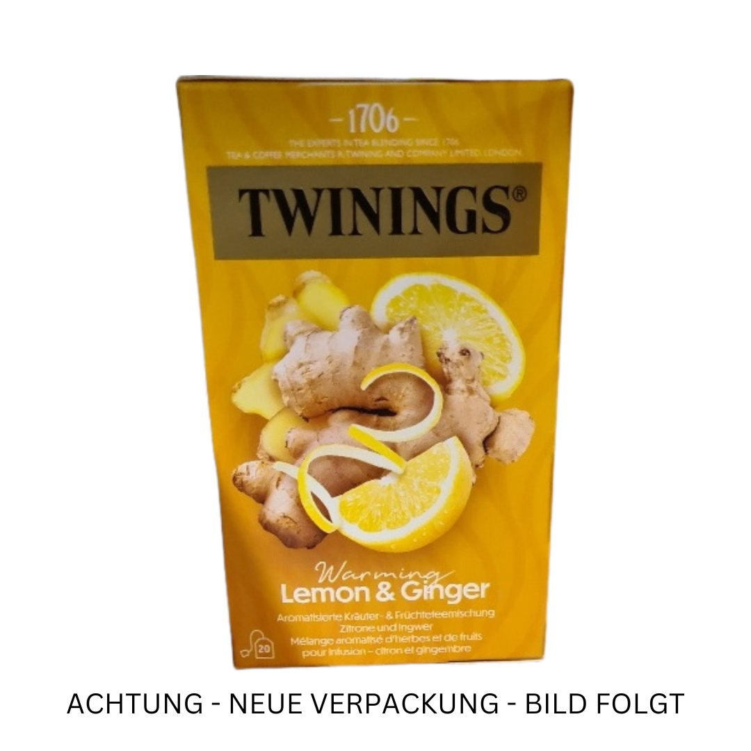Twinings Lemon & Ginger, Früchtetee, 20 Teebeutel im Kuvert, 30g Eine pikante Mischung mit feinstem Zitronen- und Ingwergeschmack, die in prickelnde Stimmung versetzt. Aromatisierte Früchte- und Kräuterteemischung Entdecken Sie den erfrischenden Geschmack von Twinings Lemon & Ginger Früchtetee! Diese aromatisierte Mischung aus Ingwer, Lindenblüten, Zitronenschale, Brombeerblättern und Zitronengras ist eine perfekte Wahl für alle, die nach einem belebenden Getränk suchen. Mit einem natürlichen Zitronen- und Ingweraroma ist dieser Tee ein wahrer Genuss für die Sinne. In jeder Packung finden Sie 20 Teebeutel im Kuvert, die einzeln verpackt sind, um die Frische und das Aroma zu bewahren. Die Netto-Füllmenge beträgt 30 Gramm und das Bruttogewicht beträgt 0,075 Kilogramm. Die Aufbewahrung ist einfach: Bewahren Sie den Tee an einem kühlen, trockenen Ort auf, um seine Qualität zu erhalten. Die Zubereitung von Twinings Lemon & Ginger Früchtetee ist kinderleicht. Legen Sie einfach einen Teebeutel in eine Tasse, übergießen Sie ihn mit kochendem Wasser und lassen Sie ihn 3-5 Minuten ziehen. Genießen Sie ihn heiß oder kalt, je nach Vorliebe. Als eine der bekanntesten Teemarken der Welt steht Twinings für Qualität und Geschmack. Mit diesem Früchtetee erhalten Sie einen köstlichen und erfrischenden Geschmack, der Sie begeistern wird. Probieren Sie Twinings Lemon & Ginger Früchtetee noch heute und lassen Sie sich von seinem einzigartigen Geschmack verzaubern! Netto Füllmenge Bruttogewicht 0.075 Kilogramm,Nettogehalt 30 Gramm Allergene Aufbewahrung Vor Wärme geschützt und trocken lagern Zutaten Ingwer (44%), Lindenblüten, Zitronenschale (12%), Brombeerblätter (12%), Zitronengras, natürliches Zitronen- und Ingweraroma mit anderen natürlichen Aromen (10%). Verwendung Verzehrfertig – Abgesehen vom Auspacken ist keine weitere Zubereitung notwendig 1 Beutel in eine Tasse geben, mit kochendem Wasser übergiessen und 3-5 Minuten ziehen lassen Marke TWININGS Hersteller Name: Maresi GmbH,Adresse: 1131 Wien
