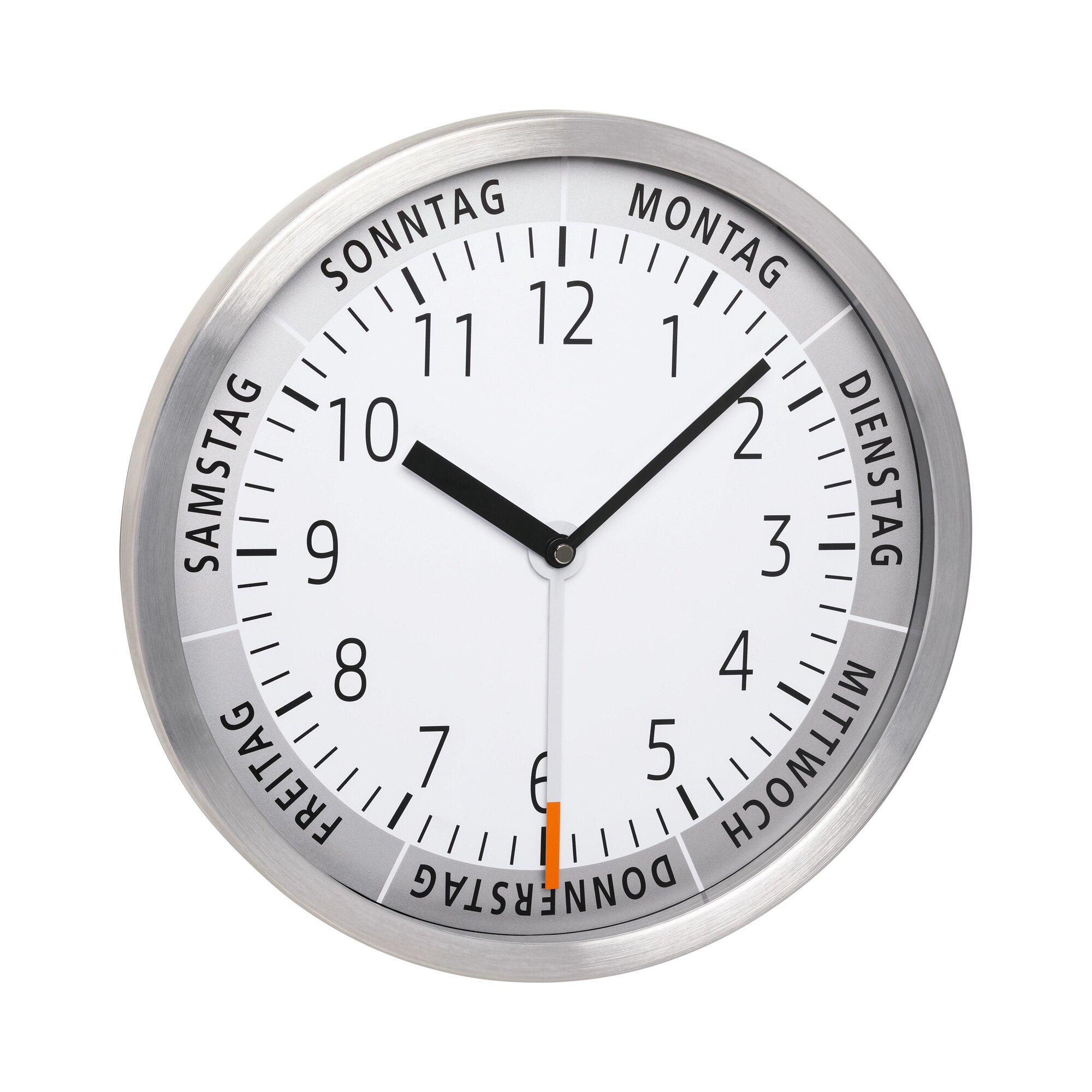 Wanduhr mit Wochentagsanzeige – (Anzeige) Aus gebürstetem Edelstahl, mit Glasabdeckung. Geräuscharmes Quarzwerk. Maße (ØxT) 30 x 4 cm Batterien (AA) bitte extra bestellen. Weitere Produktinformationen, Preis, Lieferbarkeit Gefällt mir:Gefällt mir Wird geladen … Ähnliche Beiträge