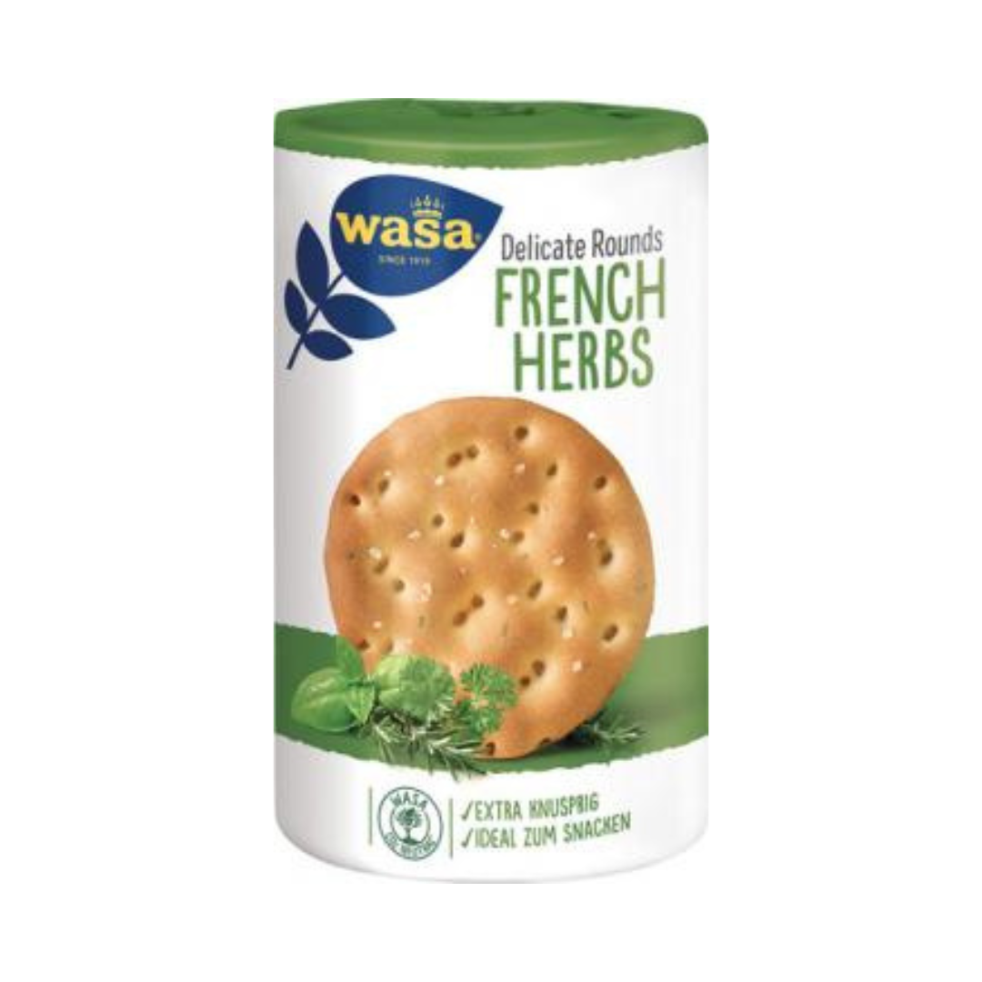 Wasa Delicate Rounds French Herbs, Knäckebrotscheiben, 205g Wenn Sie auf der Suche nach einem knusprigen und würzigen Snack sind, dann sind die Wasa Delicate Rounds French Herbs genau das Richtige für Sie! Diese Knäckebrotscheiben sind mit französischen Kräutern und Meersalz verfeinert und bieten somit ein einzigartiges Geschmackserlebnis. Die Knäckebrotscheiben bestehen zu 93% aus Weizenmehl und sind somit besonders knusprig und leicht. Rapsöl, Hefe, Zucker und weitere Zutaten machen die Delicate Rounds zu einem echten Geschmackserlebnis. Dabei sind sie auch noch glutenhaltig und können Spuren von Sesam enthalten. Pro 100g enthalten die Knäckebrotscheiben 385 kcal und 6,5g Fett. Dabei sind sie auch noch ballaststoffreich und enthalten 7g pro 100g. Die Delicate Rounds sind in einer praktischen 205g Packung erhältlich und sind somit perfekt für unterwegs oder als Snack zwischendurch. Die Wasa Delicate Rounds French Herbs werden in Schweden hergestellt und von der bekannten Marke Wasa produziert. Der Hersteller Barilla Deutschland GmbH legt dabei besonderen Wert auf die Qualität der Zutaten und die schonende Verarbeitung. Probieren Sie die knusprigen Knäckebrotscheiben jetzt selbst aus und überzeugen Sie sich von ihrem einzigartigen Geschmack. Bestellen Sie noch heute die Wasa Delicate Rounds French Herbs in unserem Onlineshop und genießen Sie einen würzigen Snack! Kleine, extra knusprige runde Knäckebrotscheiben gebacken aus Weizenmehl, mit einem köstlichen Geschmack nach Rosmarin, Basilikum und Petersilie verfeinert mit Meersalz. Knäckebrot aus Weizen mit französischen Kräutern & Meersalz Netto Füllmenge Nettogehalt 205.00 Gramm,Bruttogewicht 213.2797 Gramm Allergene Kann Spuren enthalten von Sesamsamen und -erzeugnisse,Enthält – Ist im Produkt enthalten Glutenhaltiges Getreide sowie daraus hergestellte Erzeugnisse Aufbewahrung Trocken, vor Licht und Wärme geschützt lagern. Zutaten Zutaten: WEIZENMEHL (93%), Rapsöl, Hefe, Zucker, natürliches Aroma, Emulgator (Mono- und Diglyceride von pflanzlichen Fettsäuren), Salz, Meersalz (0,56%), französische Kräuter-Mischung (Rosmarin, Petersilie, Basilikum) (0,19%). KANN SPUREN VON SESAMSAMEN ENTHALTEN. DIE HERVORGEHOBENEN ZUTATEN KÖNNEN BEI PERSONEN MIT ALLERGIEN UND UNVERTRÄGLICHKEITEN REAKTIONEN VERURSACHEN. Nährwerte pro 100g Unzubereitet 100 Gramm, Energie 1.626,00 kJ, Energie 385,00 kcal, Fett 6,50 g, davon gesättigte Fettsäuren 0,80 g, Kohlenhydrate 67,20 g, davon Zucker 4,00 g, Ballaststoffe 7,00 g, Eiweiß 11,00 g, Salz 1,00 g Ursprungsland SCHWEDEN Marke WASA Hersteller Name: Barilla Deutschland GmbH, Bereich Wasa,Adresse: Wasastraße 10, D-29229 Celle