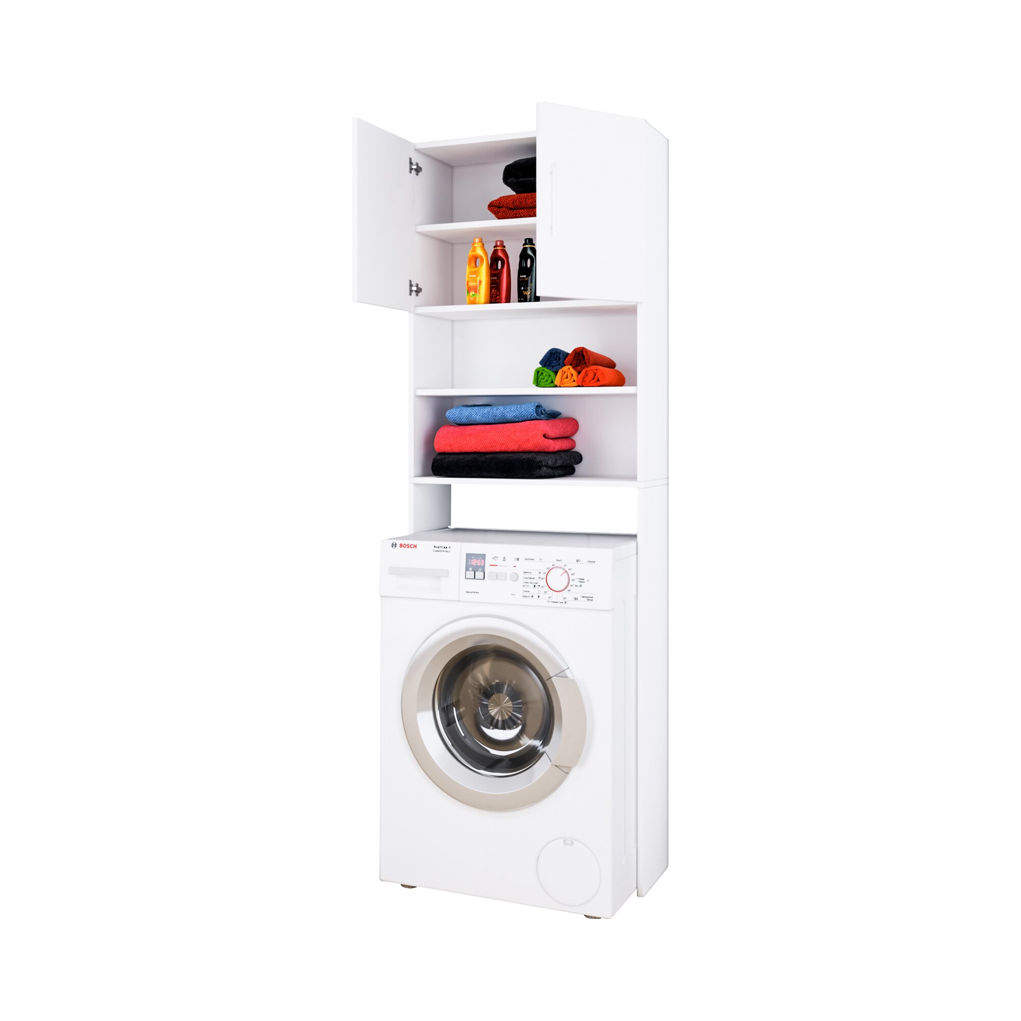 So wird der Platz gut genutzt! Dieser stabile Waschmaschinenüberbau bietet ganz viel zusätzliche Staufläche – mit ihm nutzen Sie den oft vernachlässigten Raum über der Waschmaschine oder auch dem Trockner. Mit insgesamt 4 großen Fächern, 2 offen, 2 mit Türen. Optik in Holzstruktur. Beschläge aus hochwertigem Metall, hervorragende Verarbeitung. Besonders einfache Montage! Holzstruktur-Nachbildung. Inkl. Montagematerial und einfacher Aufbauanleitung. Material: Beschläge: Metall Maße: 64 x 190 x 25 cm