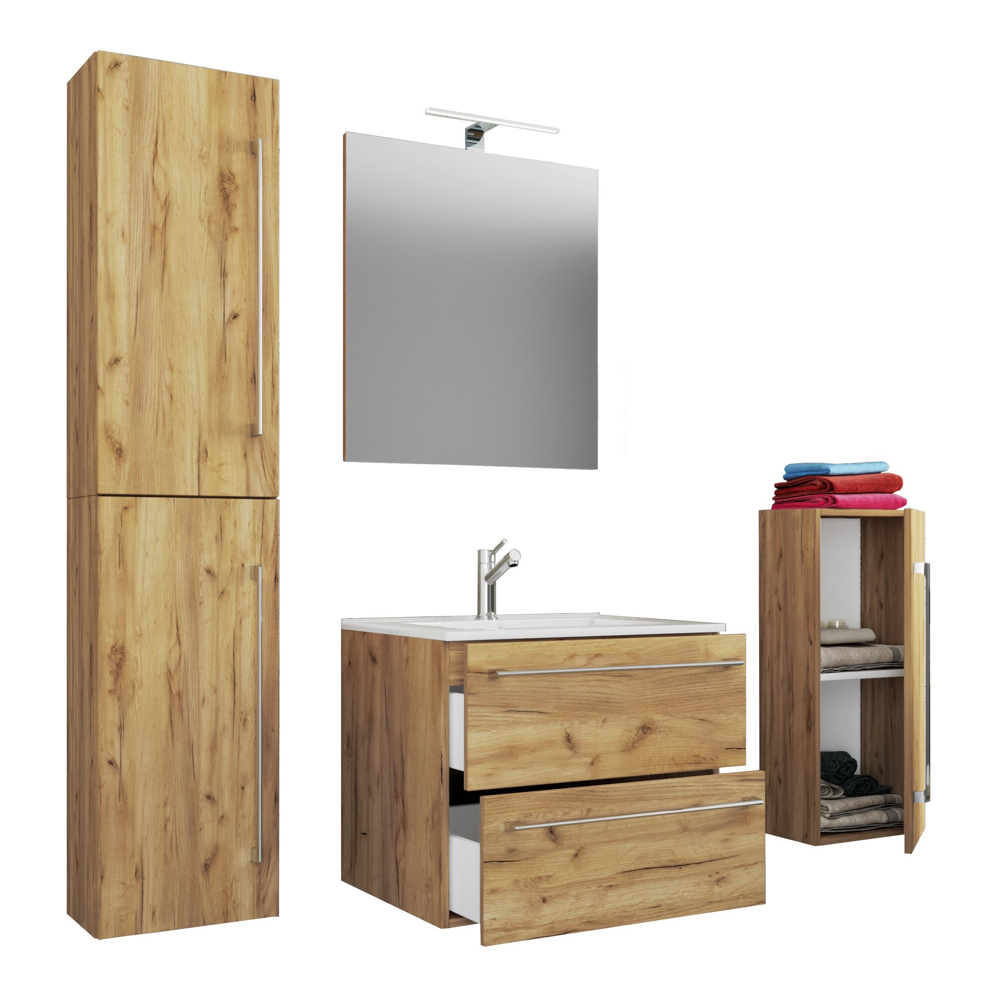 Das Badmöbel-Set besteht aus einem Hochschrank und einem Midischrank, sowie einem Unterschrank mit zwei Schubladen auf robusten Meteallschienen und zwei Seitenschränken. Ein modernes Waschbecken aus massivem Keramik und einem Spiegel aus ESG-Sicherheitsglas runden das Möbelset ab, um den perfekten Bickfang im Badezimmer zu erhalten. Maße/Material: Waschtisch-Unterschrank: H. 52 x B. 61 x T. 46 cm – Korpus aus robusten und unempflindlichem Melamin – zwei große Schubschladen mit langlebigen Metallauszügen – Griff in Alu-Optik aus Metall. Waschbecken: H. 17 x B. 60 x T. 46 cm – aus robustem Keramik Spiegel: H. 40 x B. 60 T. 2 cm – ein Fachboden für die perfekte Ordnung – Glas aus ESG-Sicherheitsglas Midischrank: H. 75 x B. 33 x T. 22 cm – 1 Fachboden zur Unterteilung Hochschrank: H. 150 x B. 33 x T. 22 cm – 2 Fachböden zur Unterteilung
