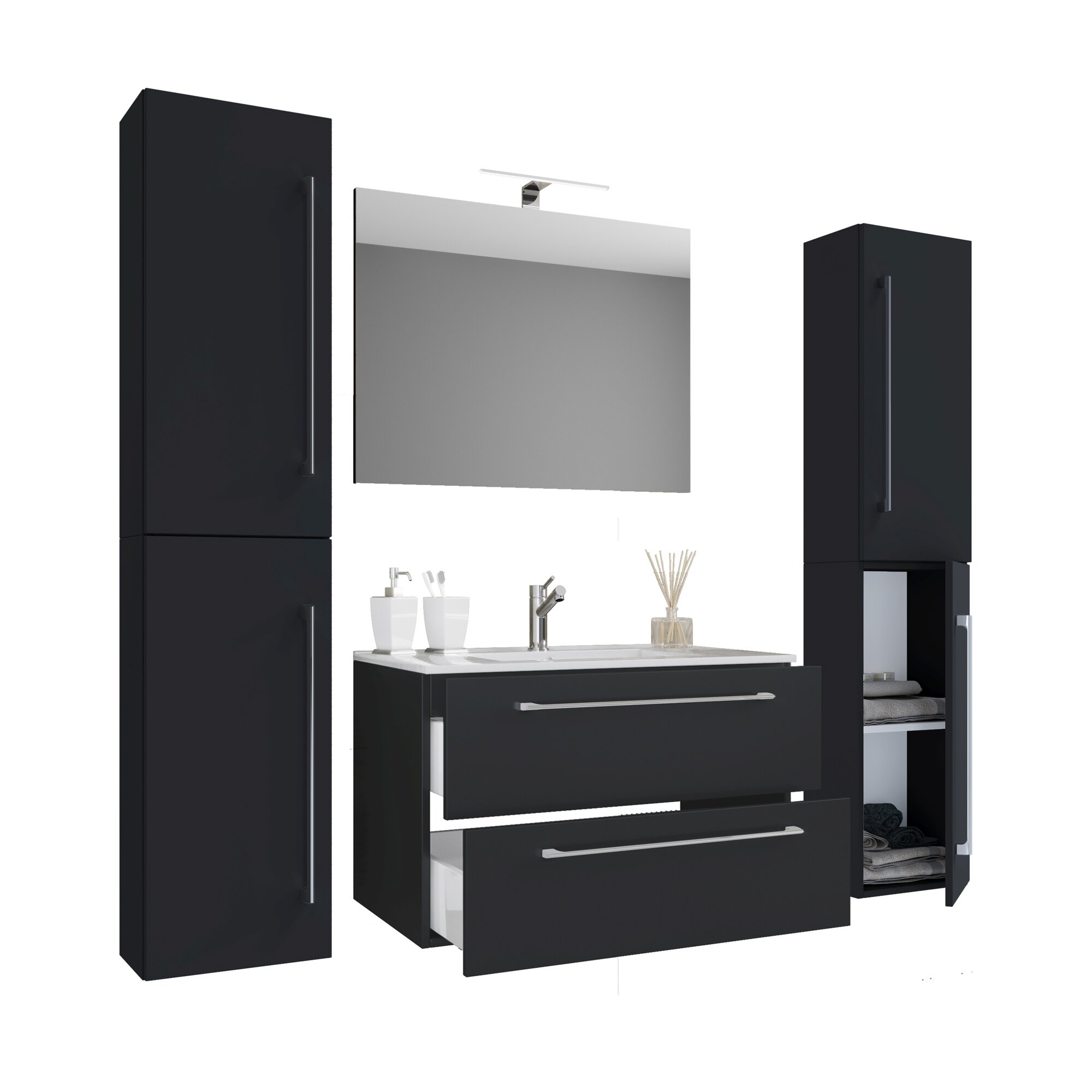 Das Badmöbel-Set besteht aus einem Unterschrank mit zwei Schubladen. Ein modernes Waschbecken aus massiver Keramik und einem Spiegel aus strapazierfähigem Glas runden das Möbel ab, um den perfekten Blickfang im Badezimmer zu erhalten. Daten: Waschtisch-Unterschrank: H. 50 x B. 80 x T. 46 cm – Korpus aus robustem und unempfindlichem Melamin – Zwei große Schubladen mit langlebigen Metallauszügen – Griff in Alu-Optik aus Metall – Einfache und sichere Wandmontage. Waschbecken: H. 17 x B. 80 x T. 46 cm – aus robuster Keramik Spiegel: H. 40 x B. 80 x T. 2 cm – Spiegel aus strapazierfähigem Glas – Einfache und sichere Wandmontage 2x Hochschrank: H. 150 x B. 33 x T. 22- 2 große Türen – Griffe in Alu-Optik aus Metall – Korpus aus robustem und unempfindlichem Melamin – 2 Fachböden hinter den Türen für die perfekte Ordnung
