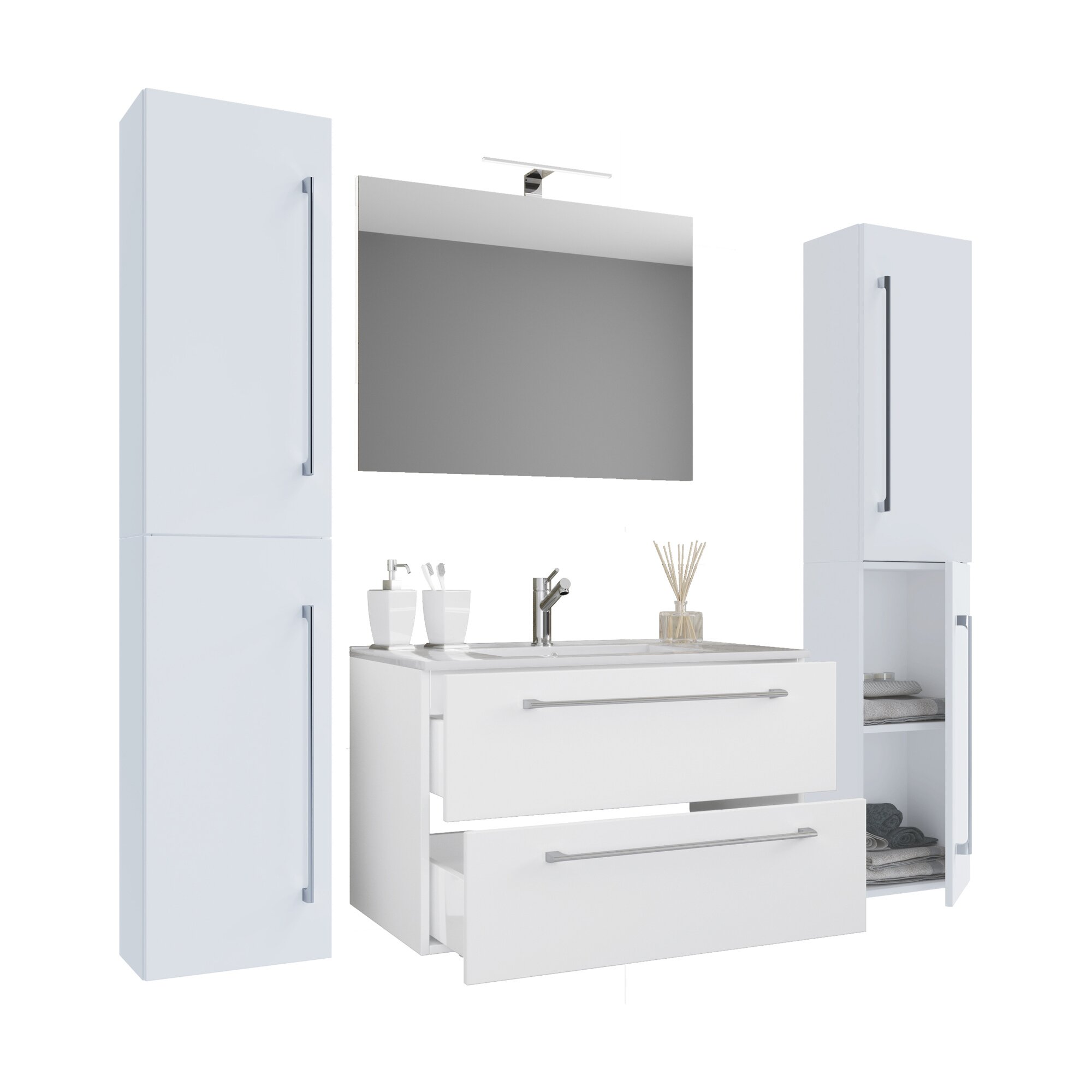 Das Badmöbel-Set besteht aus einem Unterschrank mit zwei Schubladen. Ein modernes Waschbecken aus massiver Keramik und einem Spiegel aus strapazierfähigem Glas runden das Möbel ab, um den perfekten Blickfang im Badezimmer zu erhalten. Daten: Waschtisch-Unterschrank: H. 50 x B. 80 x T. 46 cm – Korpus aus robustem und unempfindlichem Melamin – Zwei große Schubladen mit langlebigen Metallauszügen – Griff in Alu-Optik aus Metall – Einfache und sichere Wandmontage. Waschbecken: H. 17 x B. 80 x T. 46 cm – aus robuster Keramik Spiegel: H. 40 x B. 80 x T. 2 cm – Spiegel aus strapazierfähigem Glas – Einfache und sichere Wandmontage 2x Hochschrank: H. 150 x B. 33 x T. 22- 2 große Türen – Griffe in Alu-Optik aus Metall – Korpus aus robustem und unempfindlichem Melamin – 2 Fachböden hinter den Türen für die perfekte Ordnung