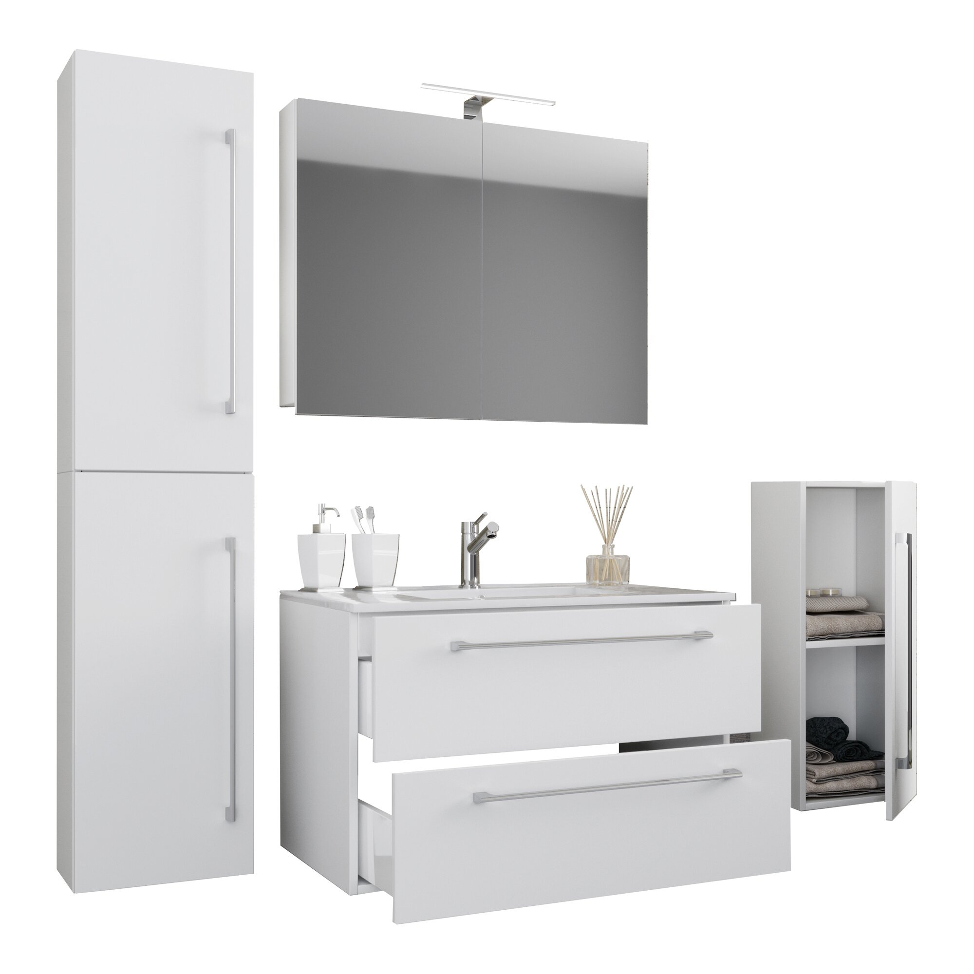 Das Badmöbel-Set besteht aus einem Hochschrank, einem Midischrank sowie einem Unterschrank mit zwei Schubladen auf robusten Meteallschienen und zwei Seitenschränken. Ein modernes Waschbecken aus massivem Keramik und einem Spiegelschrank aus ESG-Sicherheitsglas runden das Möbelset ab, um den perfekten Bickfang im Badezimmer zu erhalten. Maße/Material: Waschtisch-Unterschrank: H. 52 x B. 61 x T. 46 cm – Korpus aus robusten und unempflindlichem Melamin – zwei große Schubschladen mit langlebigen Metallauszügen – Griff in Alu-Optik aus Metall. Waschbecken: H. 17 x B. 60 x T. 46 cm – aus robustem Keramik Spiegelschrank: H. 60 x B. 60 x. T. 12 cm – ein Fachboden für die perfekte Ordnung – Glas aus ESG-Sicherheitsglas Midischrank: H. 75 x B. 35 x T. 22 cm – 1 Fachboden zur Unterteilung Hochschrank: H. 150 x B. 35 x T. 22 cm – 2 Fachböden zur Unterteilung