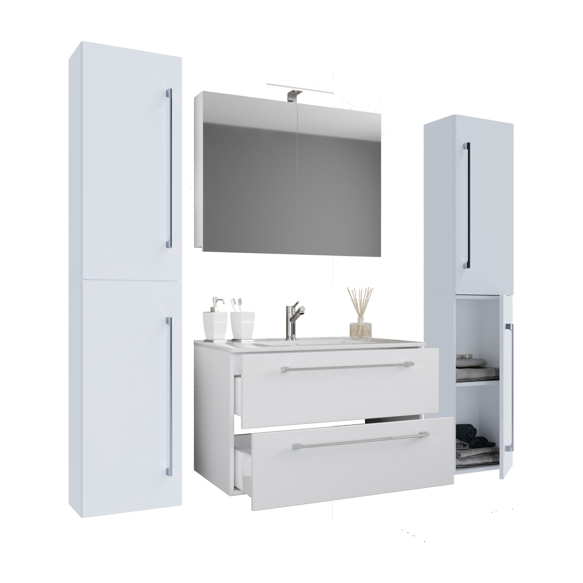Das Badmöbel-Set besteht aus einem Unterschrank mit zwei Schubladen. Ein modernes Waschbecken aus massiver Keramik und einem Spiegel strapazierfähigem Glas runden das Möbelset ab, um den perfekten Blickfang im Badezimmer zu erhalten. Maße/Material: Waschtisch-Unterschrank: H. 50 x B. 80 x T. 46 cm – Korpus aus robustem und unempfindlichem Melamin – zwei große Schubladen mit langlebigen Metallauszügen – Griff in Alu-Optik aus Metall – Einfache und sichere Wandmontage. Waschbecken: H. 17 x B. 80 x T. 46 cm – aus robuster Keramik Spiegelschrank: H. 62 x B. 80 x T. 12 cm – Spiegel aus strapazierfähigem Glas – Zwei Drehtüren, dahinter ein Fachboden – Korpus aus robustem und unempfindlichem Melamin – Einfache und sichere Wandmontage 2x Hochschrank: H. 150 x B. 33 x T. 22 cm – 2 große Türen – Griffe in Alu-Optik aus Metall – Korpus aus robustem und unempfindlichem Melamin – 2 Fachböden hinter den Türen für die perfekte Ordnung.