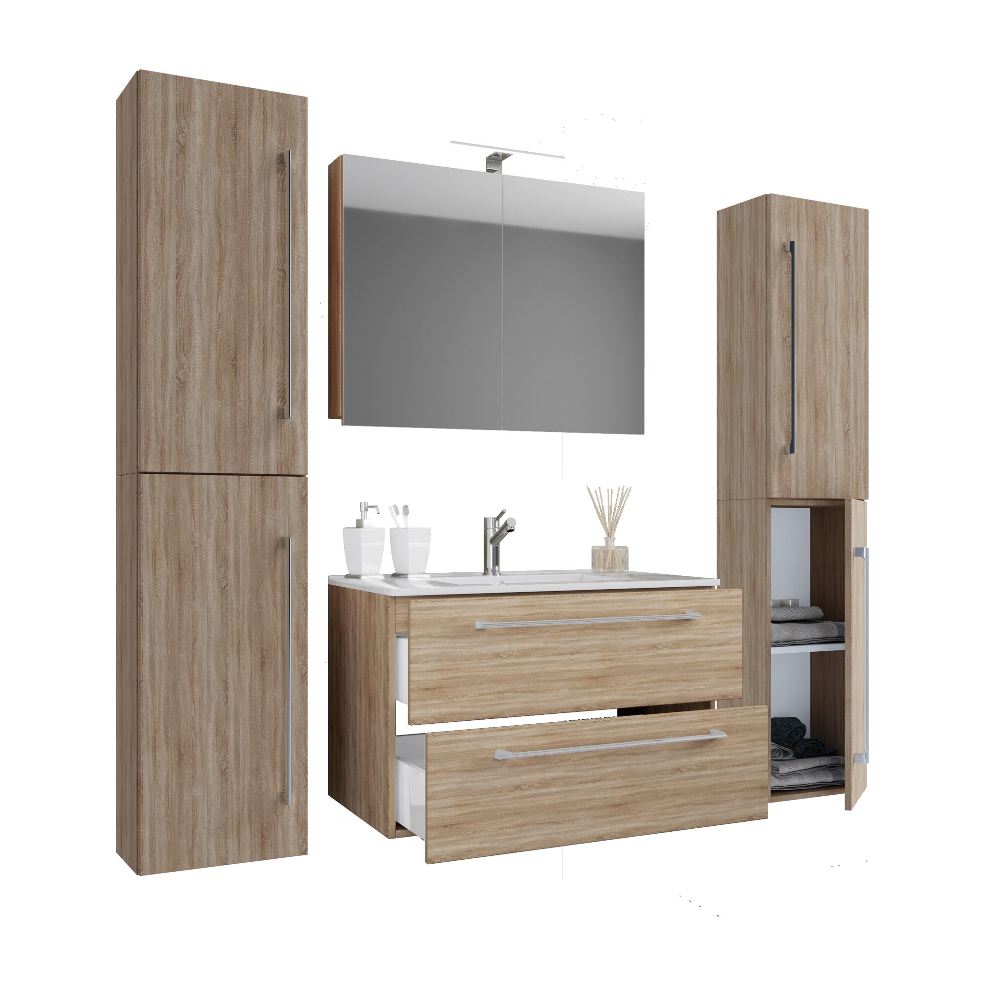 Das Badmöbel-Set besteht aus einem Unterschrank mit zwei Schubladen. Ein modernes Waschbecken aus massiver Keramik und einem Spiegel strapazierfähigem Glas runden das Möbelset ab, um den perfekten Blickfang im Badezimmer zu erhalten. Maße/Material: Waschtisch-Unterschrank: H. 50 x B. 80 x T. 46 cm – Korpus aus robustem und unempfindlichem Melamin – zwei große Schubladen mit langlebigen Metallauszügen – Griff in Alu-Optik aus Metall – Einfache und sichere Wandmontage. Waschbecken: H. 17 x B. 80 x T. 46 cm – aus robuster Keramik Spiegelschrank: H. 62 x B. 80 x T. 12 cm – Spiegel aus strapazierfähigem Glas – Zwei Drehtüren, dahinter ein Fachboden – Korpus aus robustem und unempfindlichem Melamin – Einfache und sichere Wandmontage 2x Hochschrank: H. 150 x B. 33 x T. 22 cm – 2 große Türen – Griffe in Alu-Optik aus Metall – Korpus aus robustem und unempfindlichem Melamin – 2 Fachböden hinter den Türen für die perfekte Ordnung.