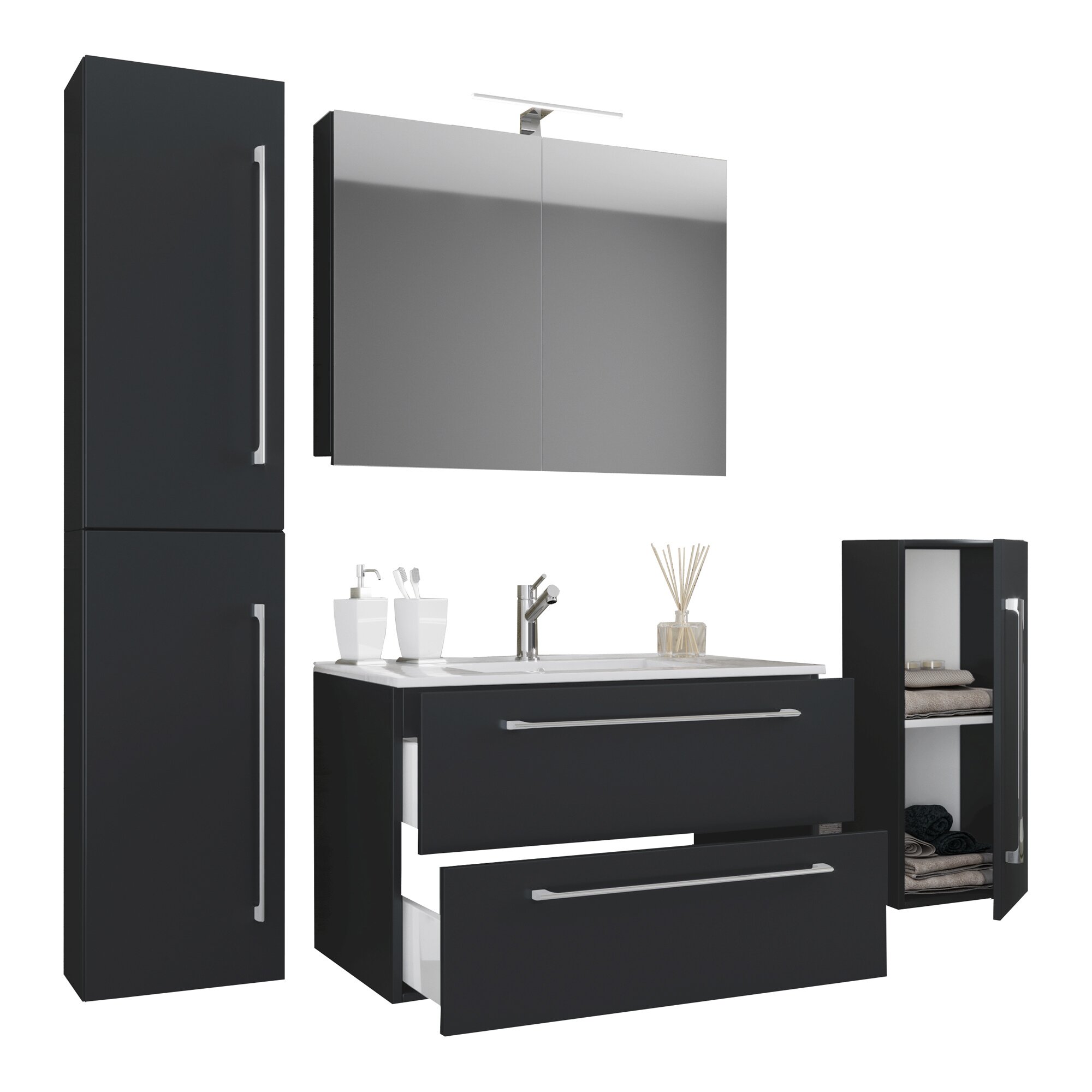 Das Badmöbel-Set besteht aus einem Hochschrank, einem Midischrank sowie einem Unterschrank mit zwei Schubladen auf robusten Meteallschienen und zwei Seitenschränken. Ein modernes Waschbecken aus massivem Keramik und einem Spiegelschrank aus ESG-Sicherheitsglas runden das Möbe-Set ab, um den perfekten Bickfang im Badezimmer zu erhalten. Maße/Material: Waschtisch-Unterschrank: H. 52 x B. 81 x T. 46 cm – Korpus aus robusten und unempflindlichem Melamin – zwei große Schubschladen mit langlebigen Metallauszügen – Griff in Alu-Optik aus Metall. Waschbecken: H. 17 x B. 80 x T. 46 cm – aus robustem Keramik Spiegelschrank: H. 60 x B. 80 x T. 12 cm – ein Fachboden für die perfekte Ordnung – Glas aus ESG-Sicherheitsglas. Midischrank: H. 75 x B. 35 x T. 22 cm – 1 Fachboden zur Unterteilung Hochschrank: H. 150 x B. 35 x T. 22 cm – 2 Fachböden zur Unterteilung