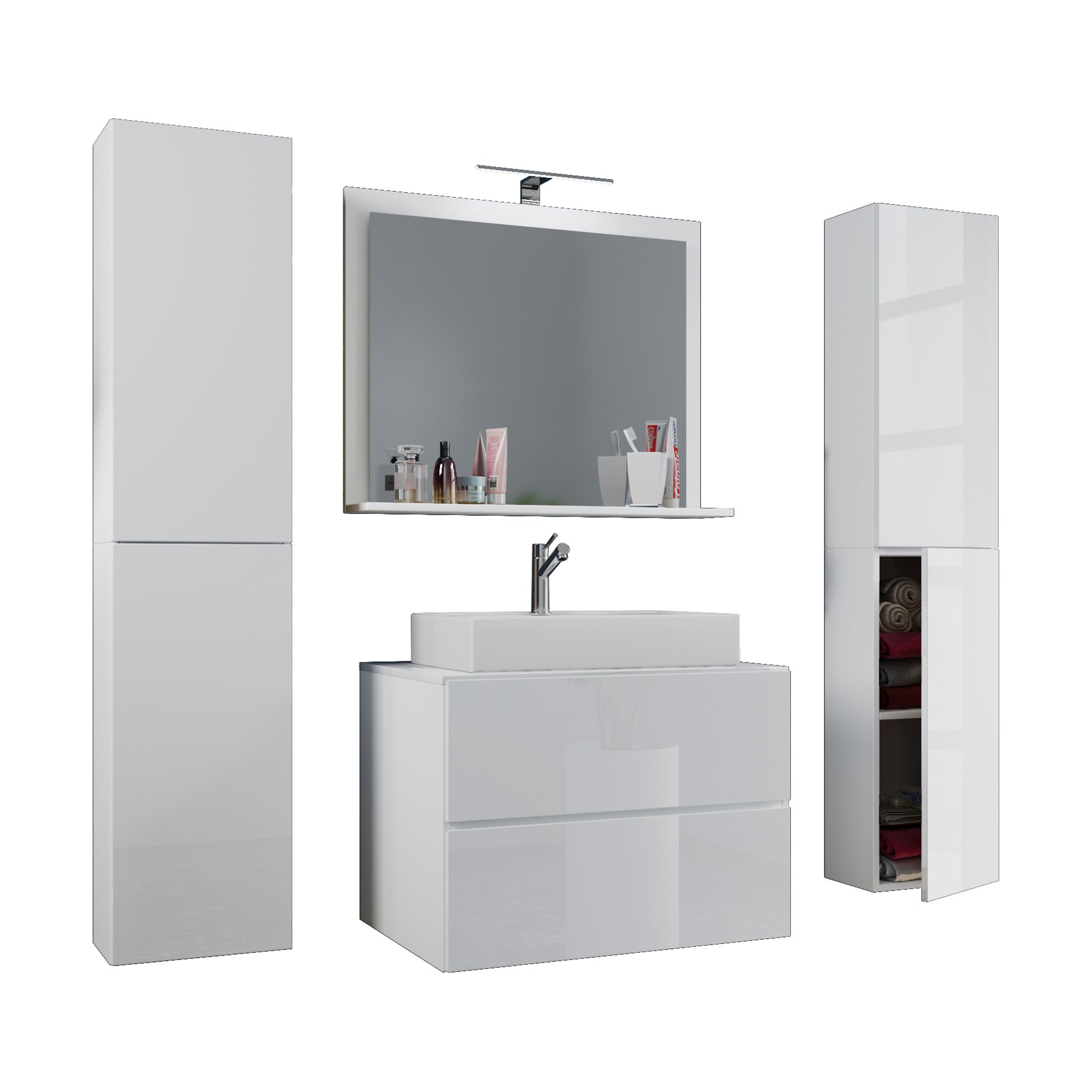 Das Badmöbel-Set besteht aus zwei Hochschränken sowie einem Unterschrank mit zwei Schubladen auf robusten Metallschienen. Das Möbel ist mit einer praktischen Push-to-Open-Funktion ausgestattet. Ein modernes Waschbecken aus massiver Keramik rundet das Möbel ab, um den perfekten Bickfang im Badezimmer zu erhalten. Maße/Material: Waschtisch-Unterschrank: Maße: H. 52 x B. 81 x T. 46 cm – Korpus mit robuster und unempfindlicher Melamin-Beschichtung – zwei große Schubschladen mit langlebigen Metallauszügen. Waschbecken: Maße: H. 17 x B. 60 x T. 46 cm – aus robuster Keramik Spiegel: Maße: H. 65 x B. 80 cm – ein Fachboden für die perfekte Ordnung – aus ESG-Sicherheitsglas Hochschrank: Maße: H. 150 x B. 33 x T. 22 cm – 2 Fachböden zur Unterteilung