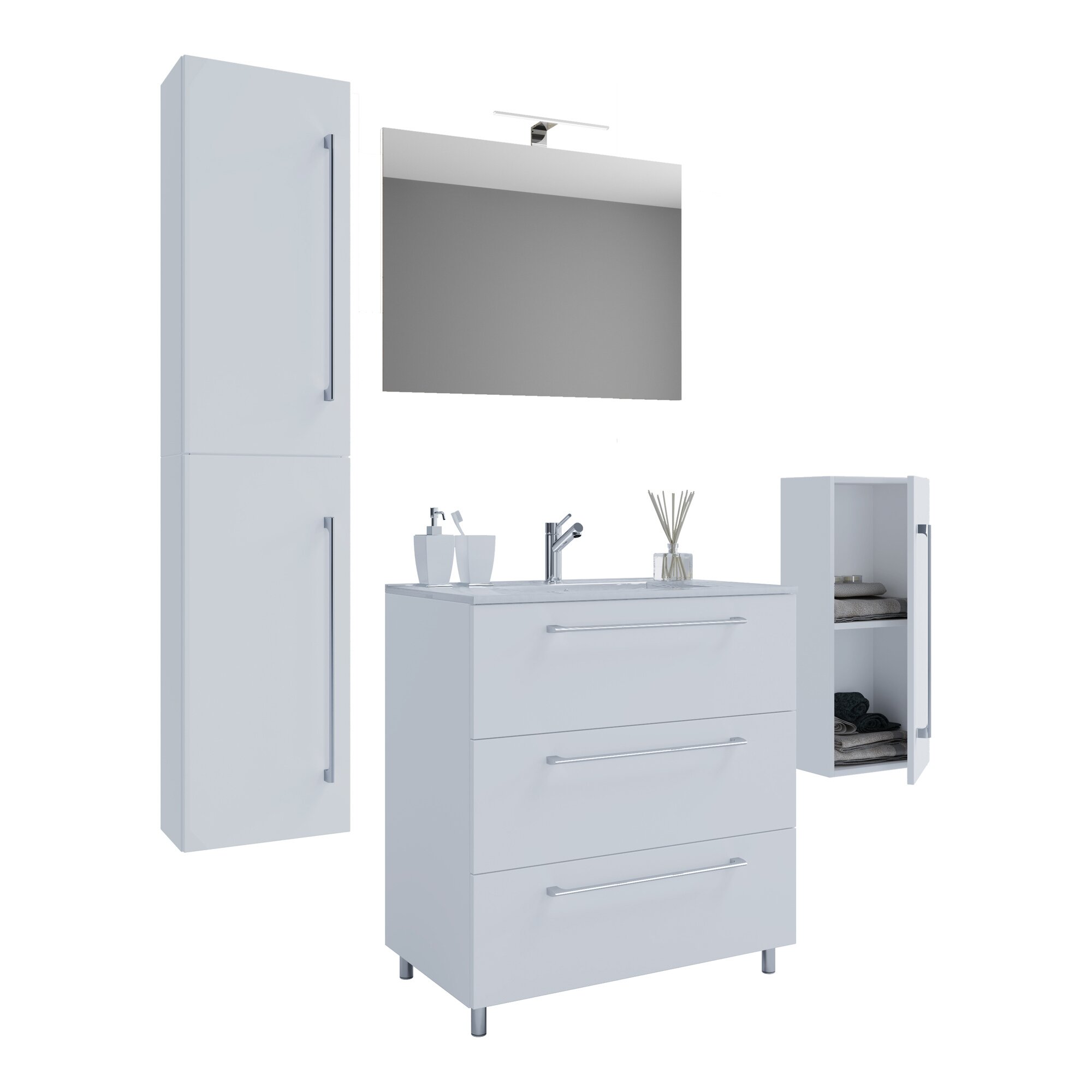 Das Badmöbel-Set besteht aus einem Unterschrank mit drei leichtgängigen Schubladen mit Metallauszügen. Ein modernes Waschbecken aus massiver Keramik und einem Spiegel aus strapazierfähigem Glas runden das Möbelset ab, um den perfekten Blickfang im Badezimmer zu erhalten. Maße/Material: Waschtisch-Unterschrank: H. 86 x B. 80 x T. 46 cm – Korpus aus robustem und unempfindlichem Melamin, drei große Schubladen mit langlebigen Metallauszügen, Griff in Alu-Optik aus Metall. Standsicherheit durch Standfüße. Waschbecken: H. 17 x B. 80 x T. 46 cm – aus robuster Keramik Spiegel: H. 40 x B. 80 x T. 2 cm – aus strapazierfähigem Glas, einfache und sichere Wandmontage Midi-Schrank: H. 75 x B. 33 x T. 22 cm – eine hohe Tür für geschlossenen Stauraum, Griffe in Alu-Optik aus Metall, Korpus aus robustem und unempfindlichem Melamin. Hinter der Tür ein Fachboden zur perfekten Ordnung. Hochschrank: H. 150 x B. 33 x T. 22 cm – 2 große Türen, Griffe in Alu-Optik aus Metall, Korpus aus robustem und unempfindlichem Melamin, 2 Fachböden hinter den Türen für die perfekte Ordnung.