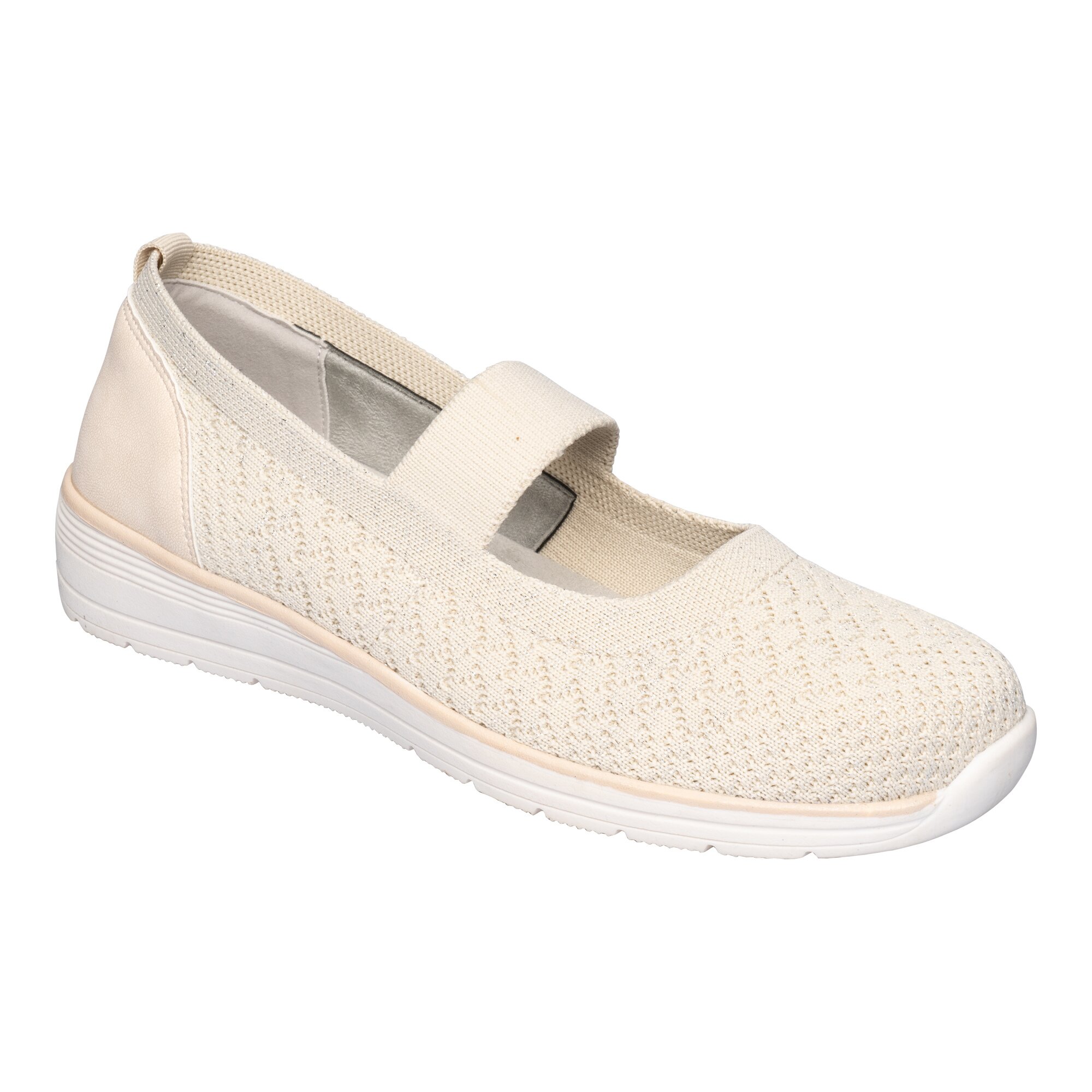 Guter Halt dank Stretch-Riemchen über dem Rist, das sich Ihrem Fuß perfekt anpasst. Das flexible Material ist auch bei Hallux valgus eine perfekte Wahl. Rutschhemmende Gummi-Laufsohle für ein angenehmes Gehgefühl.