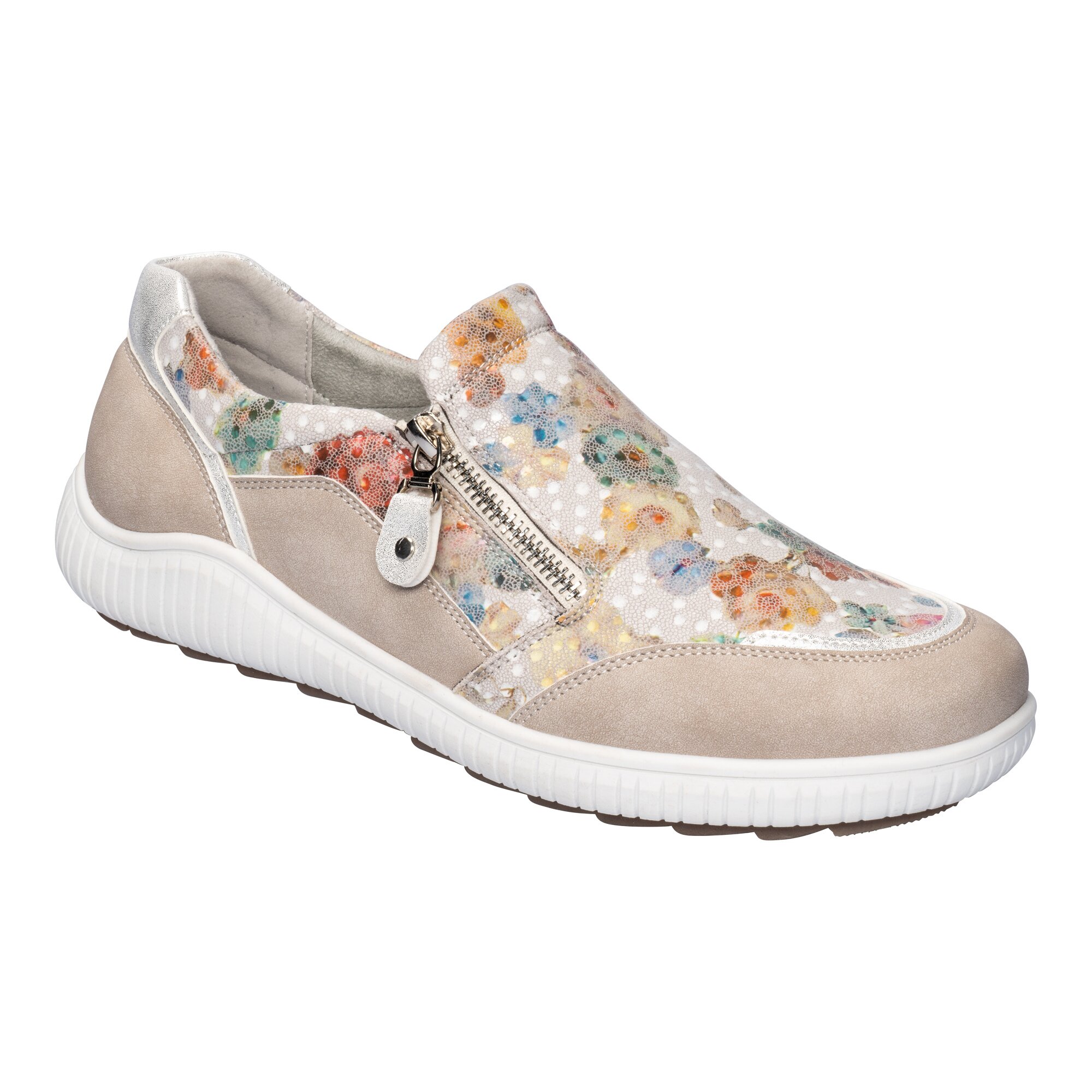 Angesagter Halbschuh in edler Veloursleder-Optik. Das florale Muster mit Glanzeffekt verleiht dem Schuh eine erfrischende Note. Der Reißverschluss erleichtert den Ein- und Ausstieg, während der Stretch-Einsatz an der Innenseite für eine perfekte Passform sorgt. Weiche, herausnehmbare Einlegesohle und rutschhemmende Laufsohle für ein sicheres Gehgefühl.