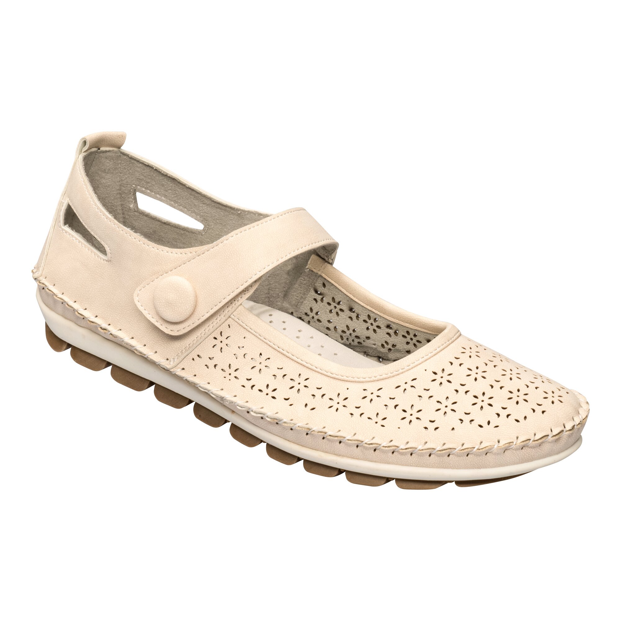 Erleben Sie die Leichtigkeit des Sommers und gleiten Sie mit diesem Schuh wie eine Ballerina über das Stadtparkett. Das florale Lochmuster lässt Ihren Fuß atmen und schenkt Ihnen ein unbeschwertes Tragegefühl. Die weiche, herausnehmbare Innensohle sorgt für die Extraportion Bequemlichkeit. Dank Klettverschluss lässt sich der Ballerina bequem an- und ausziehen und indiviuell an den Fuß anpassen. Mit rutschhemmender Laufsohle für ein angenehmes Gehgefühl.