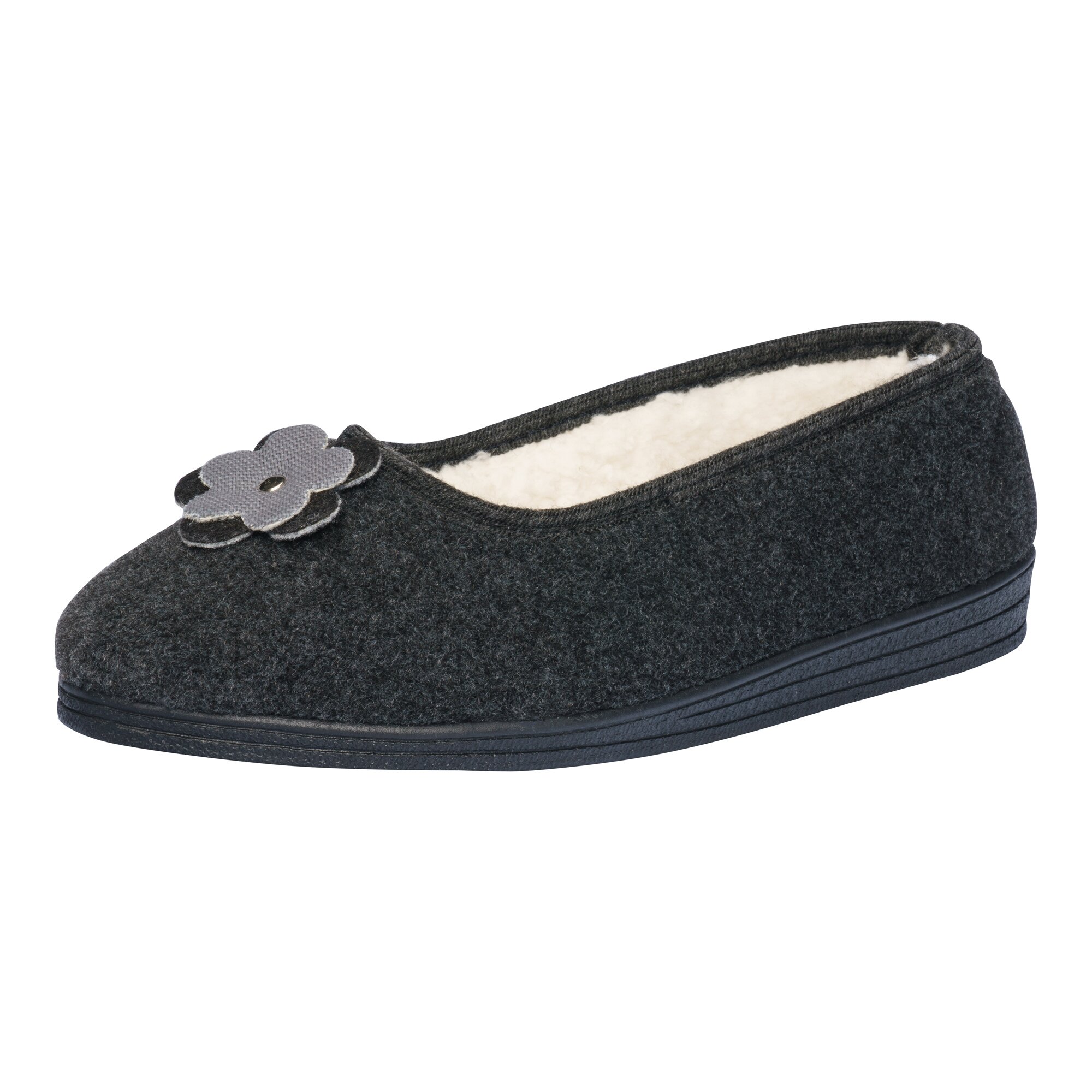 Filz ist im Winter Favorit: Ballerinas für drinnen – und draußen! weiche, flexible Laufsohle In warmem Filz fühlen sich Ihre Füße nicht nur im Winter pudelwohl. Wundervoll wohlig gefütterte Ballerinas mit hübscher Blumenapplikation und praktischer Gummisohle: Dadurch auch für einen kurzen Gang nach draußen geeignet!