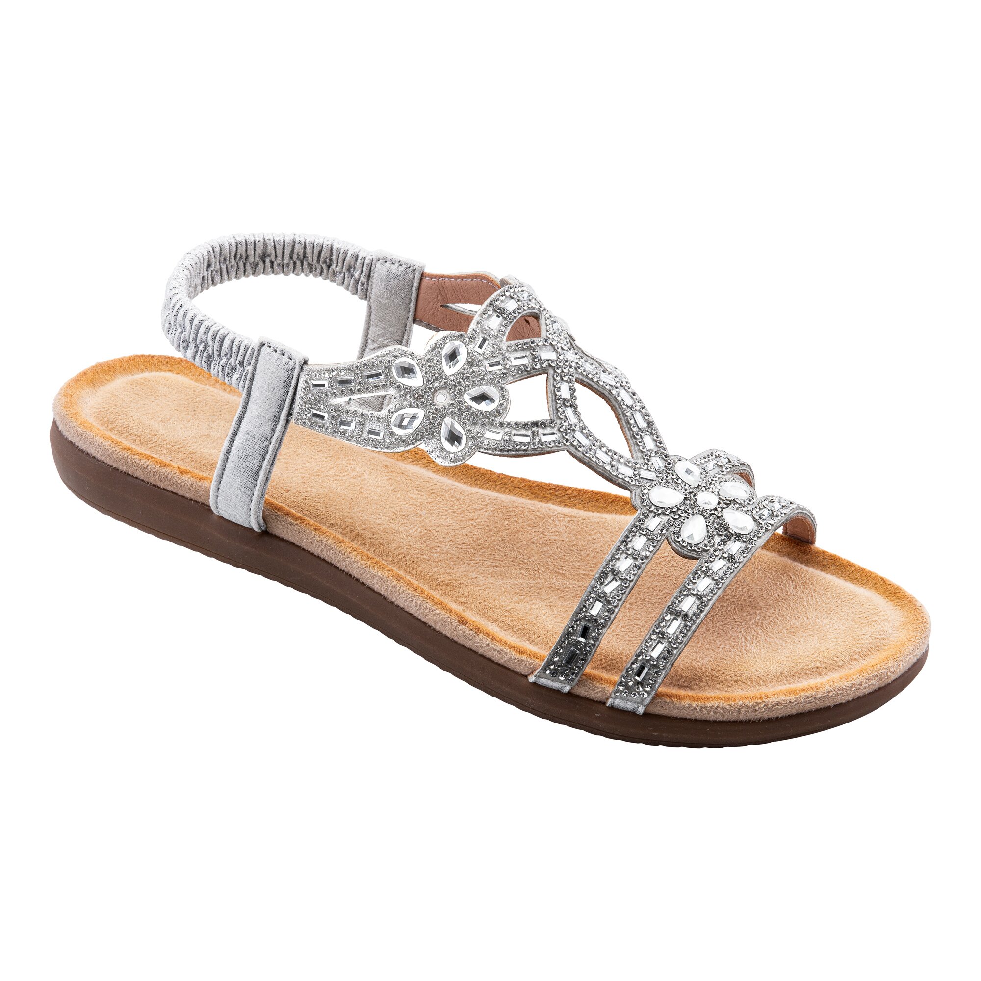 Begeben Sie sich auf eine Reise voller Eleganz mit unserer Glitzer-Sandale. Die funkelnden Glitzersteinchen sind wie Sterne, die jeden Schritt erhellen. Dank des elastischen Einsatzes gleiten Sie mühelos hinein und genießen eine optimale Anpassung an Ihren Füßen. Das weiche Fußbett aus Mikrofaser schenkt Ihnen himmlischen Komfort. Mit der rutschhemmenden Gummi-Laufsohle tanzen Sie sicher durch das Leben. Unsere Soft-Touch-Sohle lässt dich auf Wolken schreiten, während der Stretch für eine perfekte Passform sorgt. In Standardweite erhältlich, um jedem Fuß die Freiheit zu geben, die er verdient.